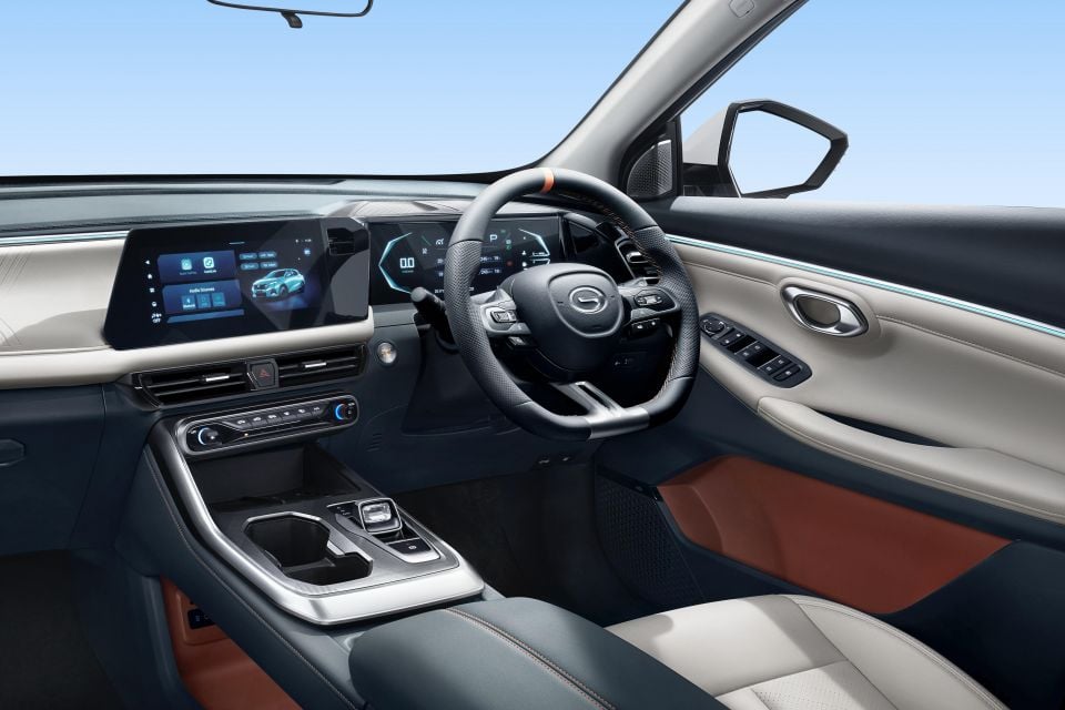 Exterior design highlights embrace GAC’s giant “Mecha Wing” grille (confusingly known as “Flying Wing” elsewhere), “Laser Eye” break up LED headlights, and “Gentle Dart” tail-light signature. GAC says the automotive’s sharp strains “seem as if they might have been minimize by diamonds themselves”.