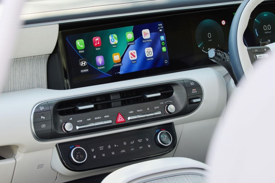 Neatly tucked into the sprint is a single panoramic show housing twin 12.3-inch screens operating Hyundai’s newest software program, which suggests wi-fi smartphone integration, crisp graphics and a tile menu system that’s a breeze to navigate.