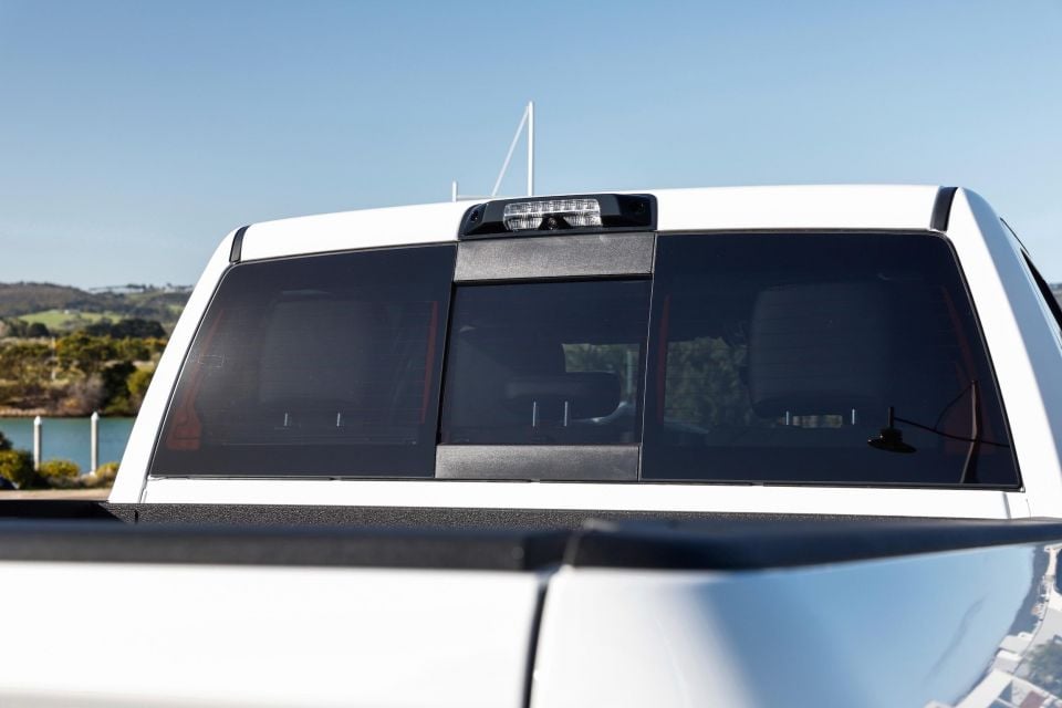 The outside match‑out consists of the Black Pack as normal in Australia (black grille, mirrors, badging and facet steps), and the Mopar Sport Efficiency Hood. There’s a spray‑in bedliner, LED mattress lighting, eight mounted tie‑down factors, a damped and centrally locked tailgate with distant launch, and a deployable rear mattress step.