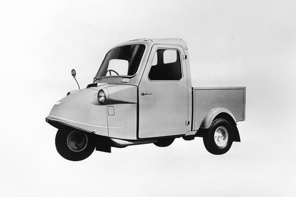 The unique Midget was launched in 1957 as a three-wheel supply ute. It had only a single seat, a deal with bar for steering, and no doorways. It was powered by a 250cc single-cylinder two-stroke engine making 6kW.