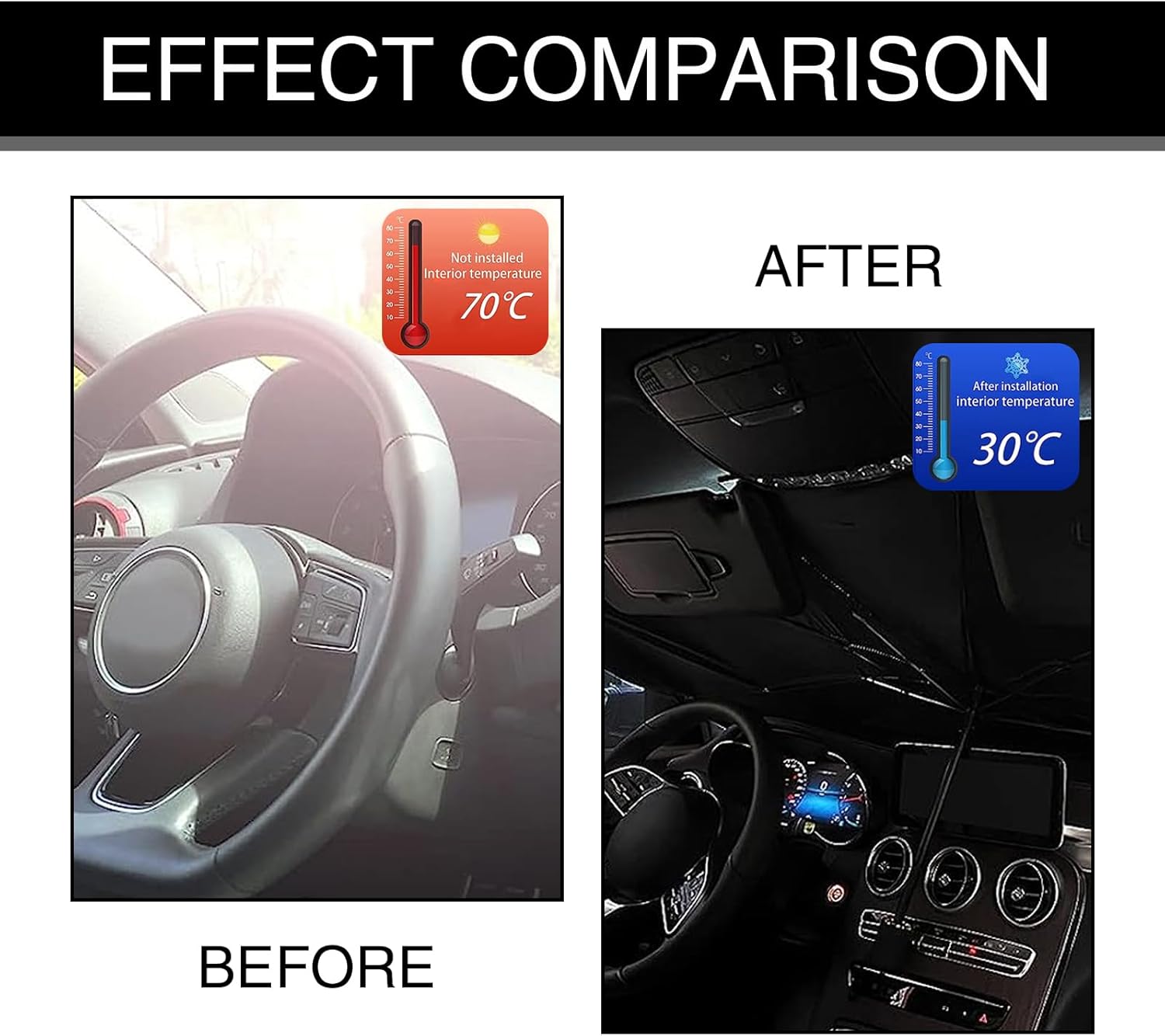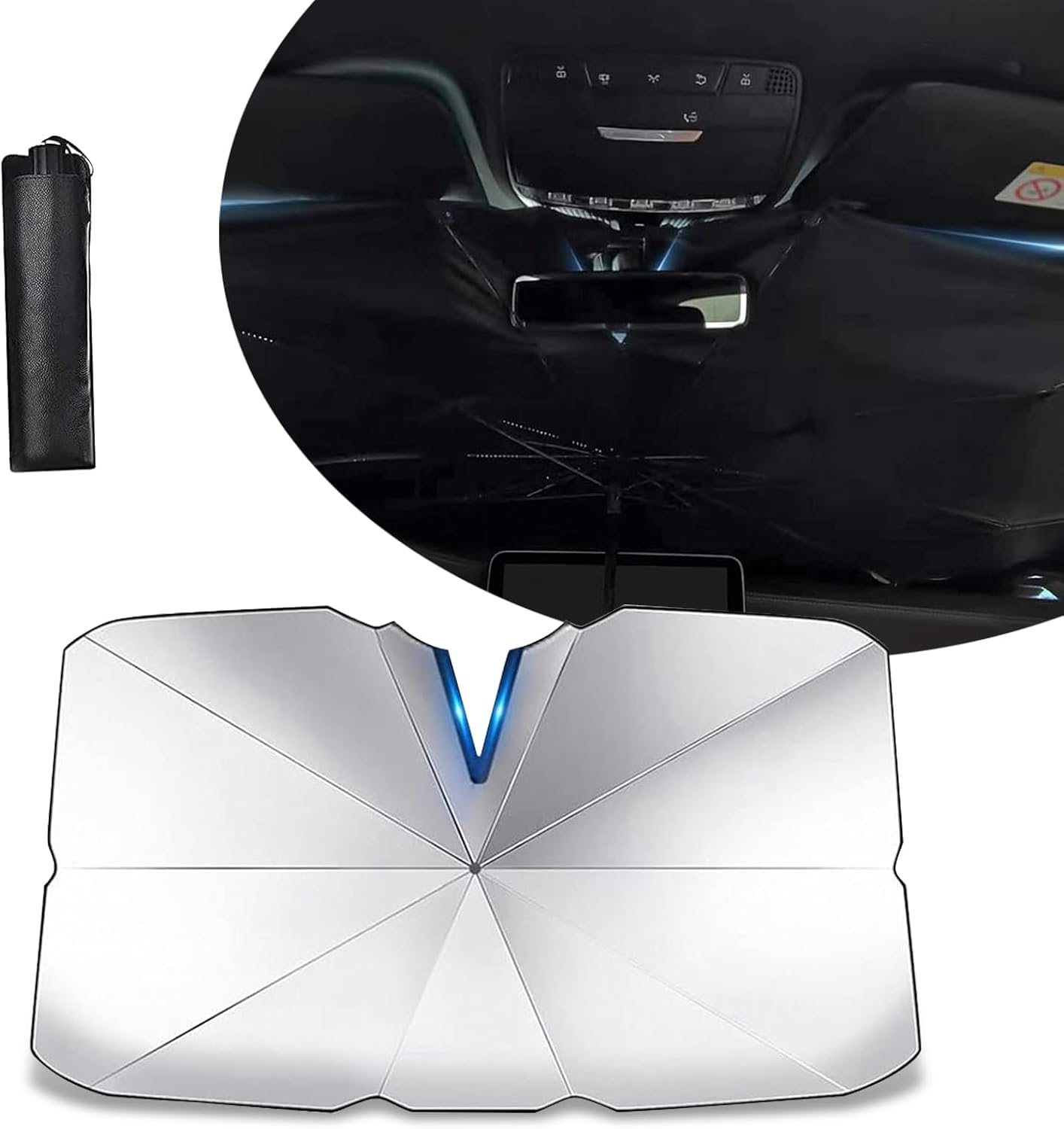 Foldable: The umbrella car windshield visor is the same as a regular umbrella and can be easily opened and folded in seconds. It can be folded into a compact size, which is easy to store and carry, and it does not take up space in the car.