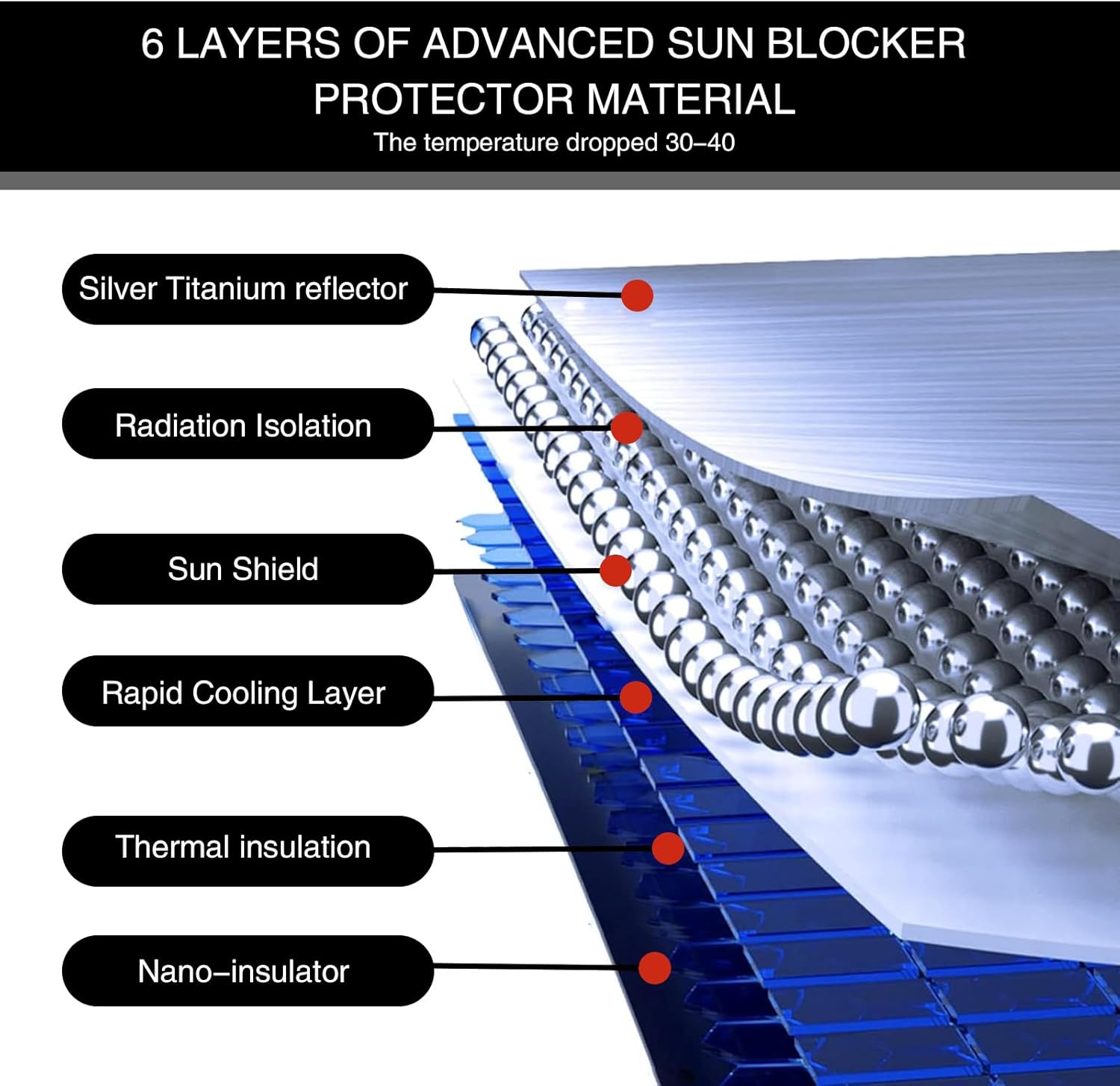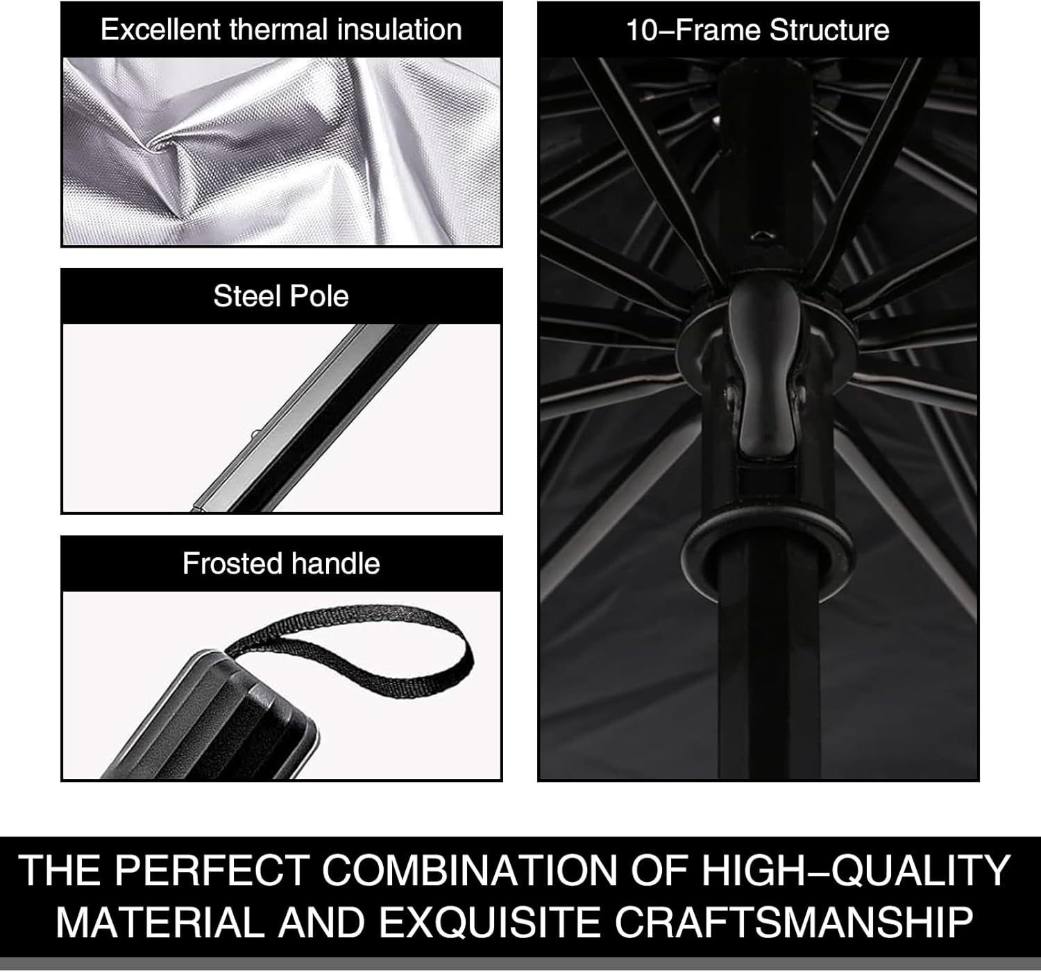 Material: This umbrella windshield sunshade is made of high-quality materials to provide maximum blocking of sunlight and heat. It can help reduce the temperature inside the car, protect the car seats, center console, dashboard and other interiors from sunlight, and improve driving comfort.