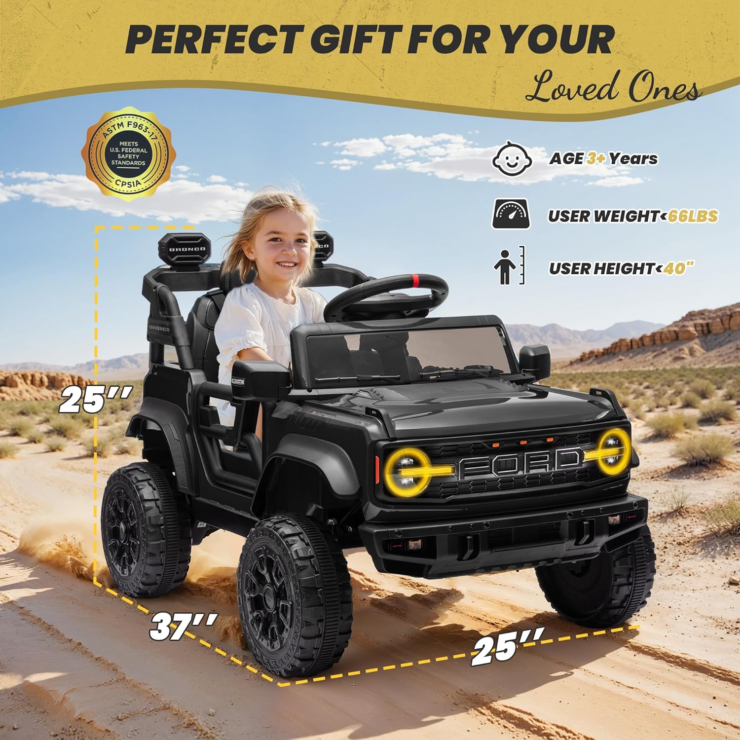 12v Ride On Truck with Remote Control Licensed Ford Bronco Raptor Electric Vehicle for Kids,Toddler Cars to Drive,Sefety Belt,Lockable Door,Slow Start,1.3-2.5 Mph,Bluetooth Music