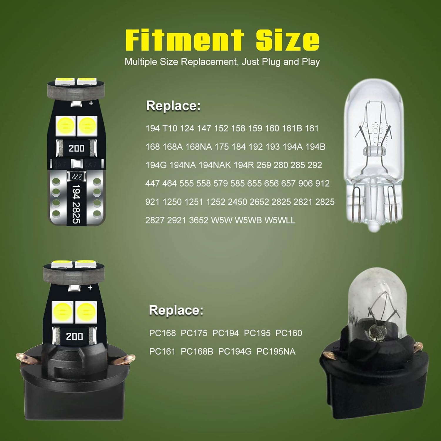 Direct replacement for all T5 T10 Wedge Type: 17 18 37 70 73 74 79 85 86 2721 PC74 PC37 PC118 882 size and T10 T15 194 168 158 W5W 161B 168 168A 168NA 175 192 193 194 194B 194G 194NA 194R 2821 2825 PC168 PC175 PC194 PC195 PC160 PC161 PC195NA etc size