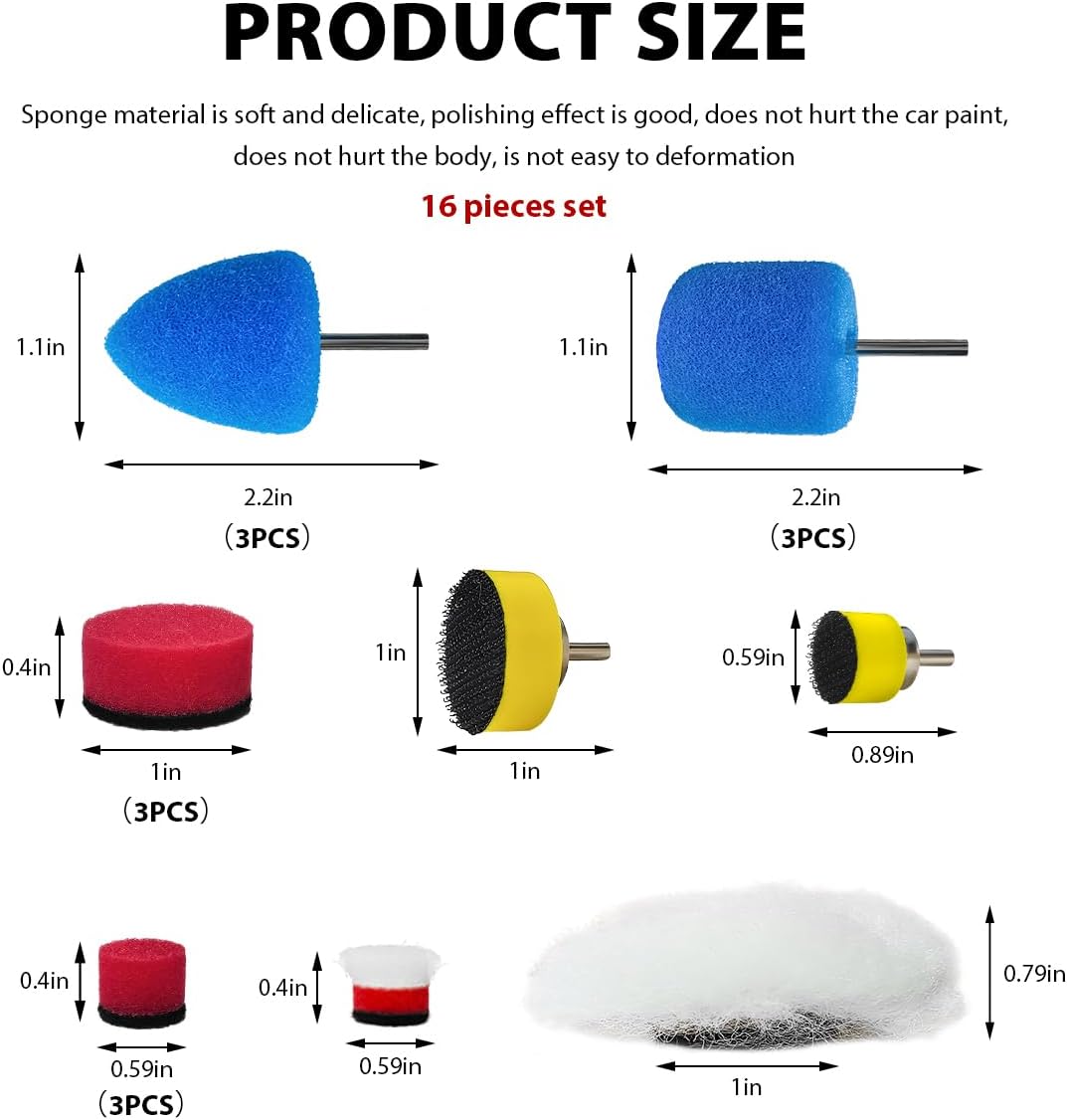 16PCS Mini Buffing Polishing Pads, Car Detail Sponge Buffing Mini Polisher Wool Pads for Rotary Tools, Auto Waxing Detailing Kit for Cordless Electric Drill Wheel Hub Cleaning