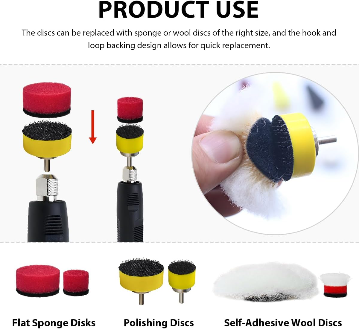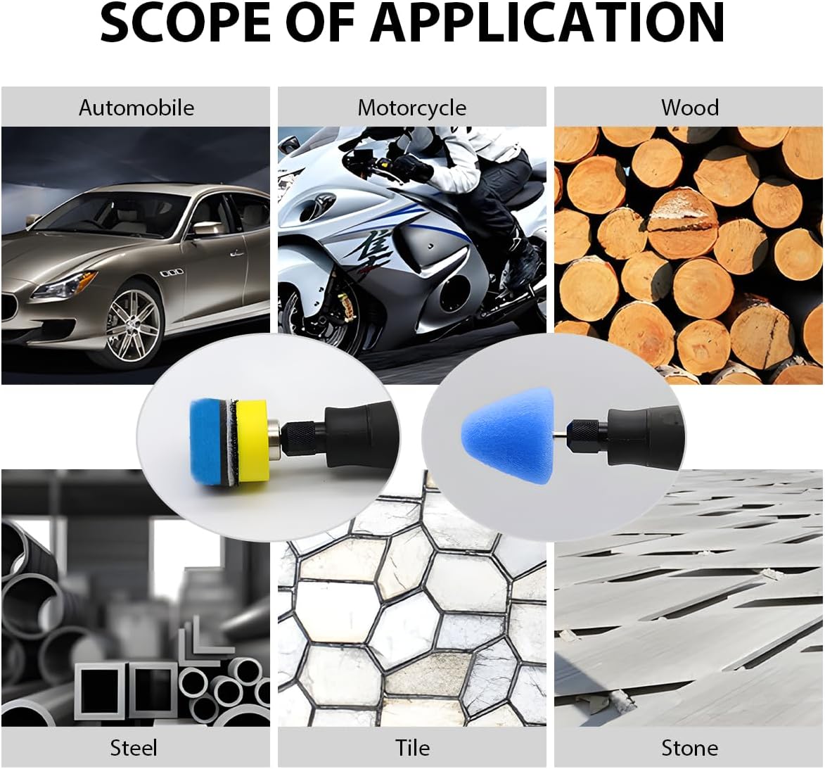 【Polishing Action】: The combination of shapes and materials makes this set easy to use for polishing large areas, cleaning edges, and detailing. Sponge pads effectively remove light scratches while enhancing shine, while wool polishing pads are ideal for fine sanding.