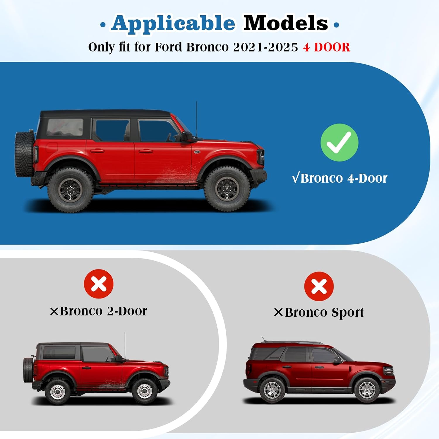 Specific Fit: Designed to fit for Ford Bronco 2021–2025 4-Door (not compatible with Bronco 2-Door or Bronco Sport). Precisely molded to seamlessly integrate with door handles and controls without interfering with door functions.