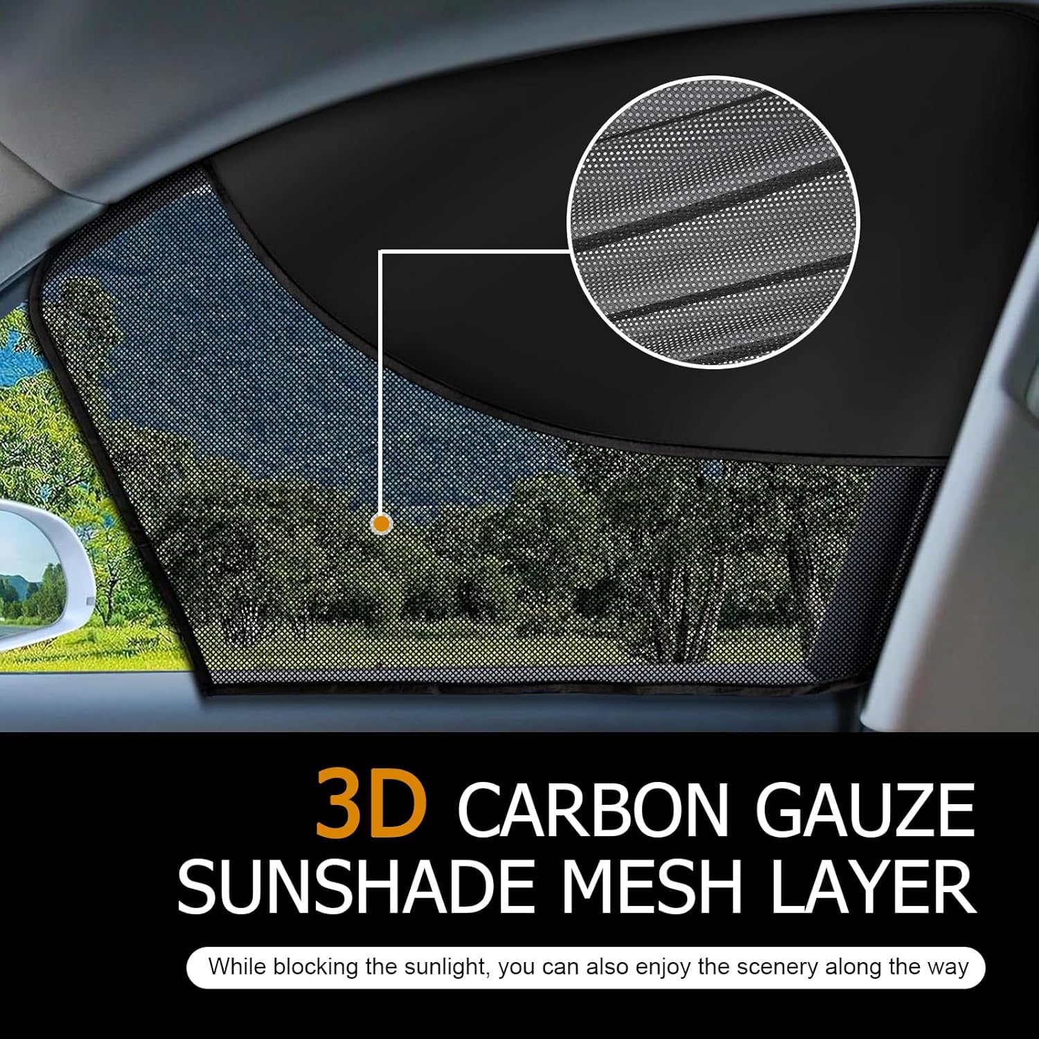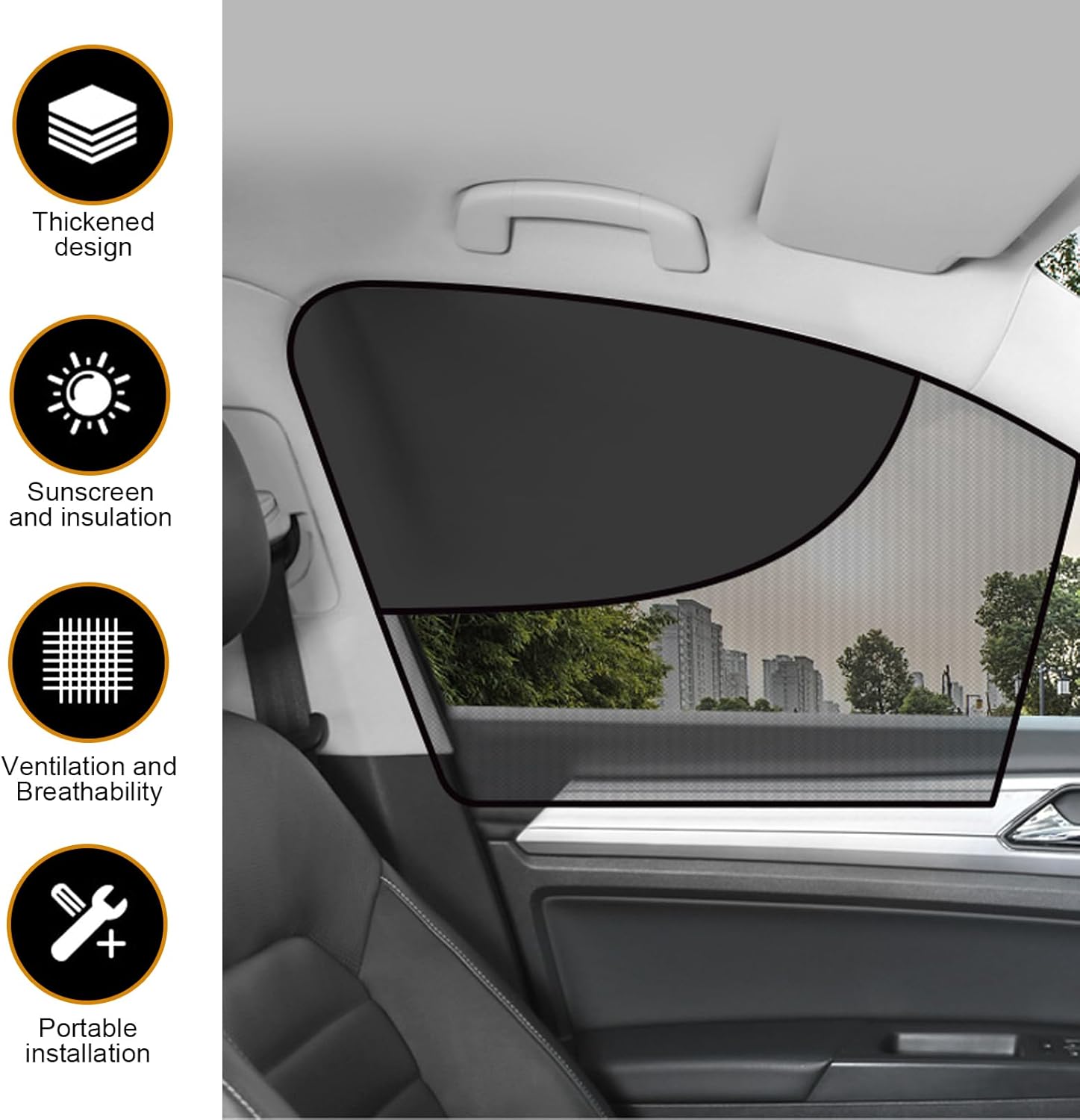 Sun Protection: The car window sunshades feature a 3D carbon shading net layer for effective sunburn protection, blocking ultraviolet rays to keep your car cool. The combination of blackout cloth and breathable mesh blocks all sunlight while allowing air circulation, making them ideal for all seasons. Drive in any weather, and these shades have you protected.