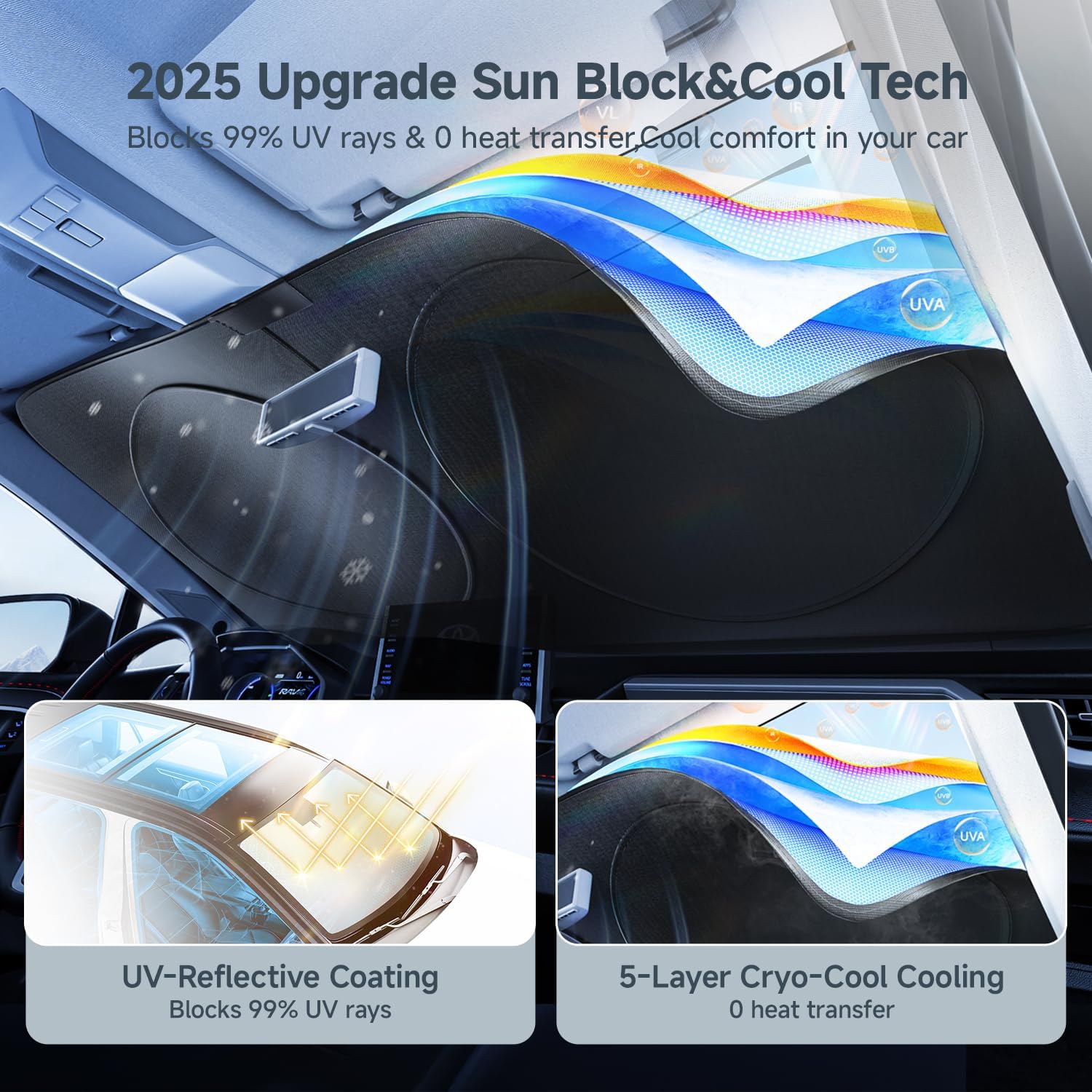 [Stay Cool in 2025 – Advanced Heat & Light Defense] Our 2025 upgraded windshield sun shade works like a “temperature force field” for your car:Blocks 99.7% sunlight with hexagonal armor edges and laser-cut reflective panels.Cools 45°F faster – Keeps seats/wheel below 90°F even in 115°F weather.Travel easily and keep you comfortable all summer long.