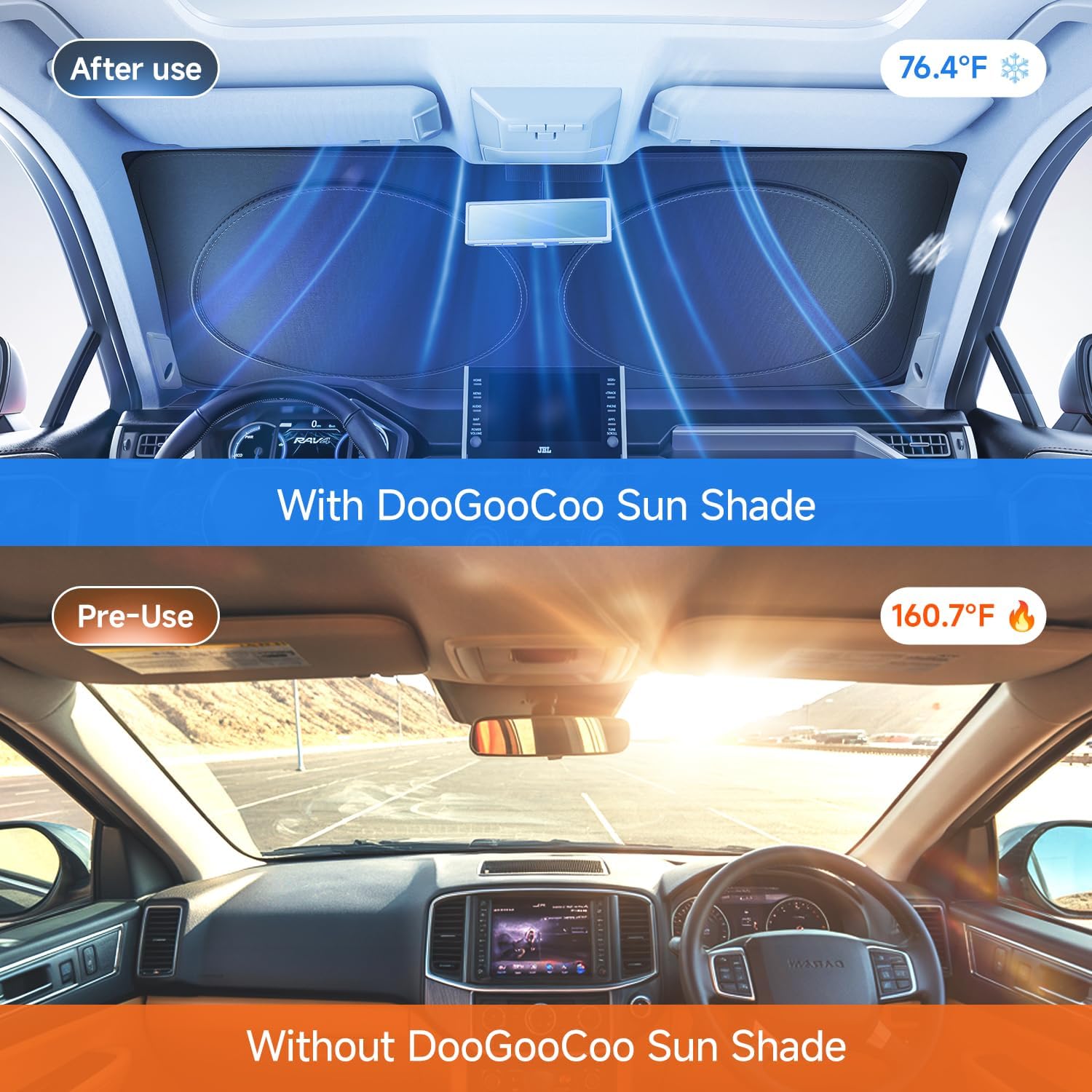 [2025 Upgrade] Doogoocoo Windshield Sun Shade, [100% Sun Block & Ice-Crystal Cooling] Protect Interior & Keep Car Cooler, Portable Foldable Car Sunshade Front Windshield (57×29 Inches)
