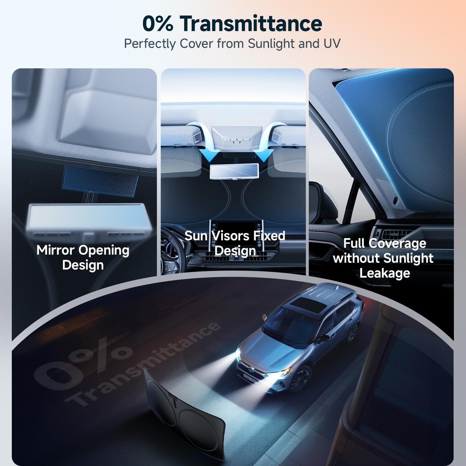 [Precise Full Coverage – Seamless Fit for 98% of Car Models] Adopts flexible and adjustable memory alloy frame with intelligent overlapping design, precisely fits all types of cars (from Sedans,Suv to Trucks), no need for custom styles. It can be stretched 360° to the edge, fits tightly with your car windshield 1:1, and eliminates light gaps regardless of the curvature of the vehicle or the angle of the glass. Combined with the upgraded rearview mirror Velcro design, it ensures complete light blocking.