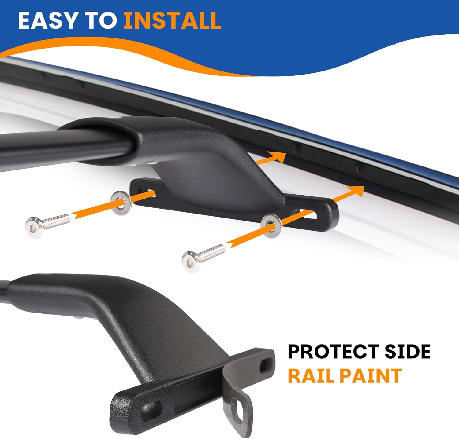 Safety & Durability: Made of thick black aluminum with a die-cast base, and equipped with sponge pads to protect the side rails’ paint while ensuring a secure fit