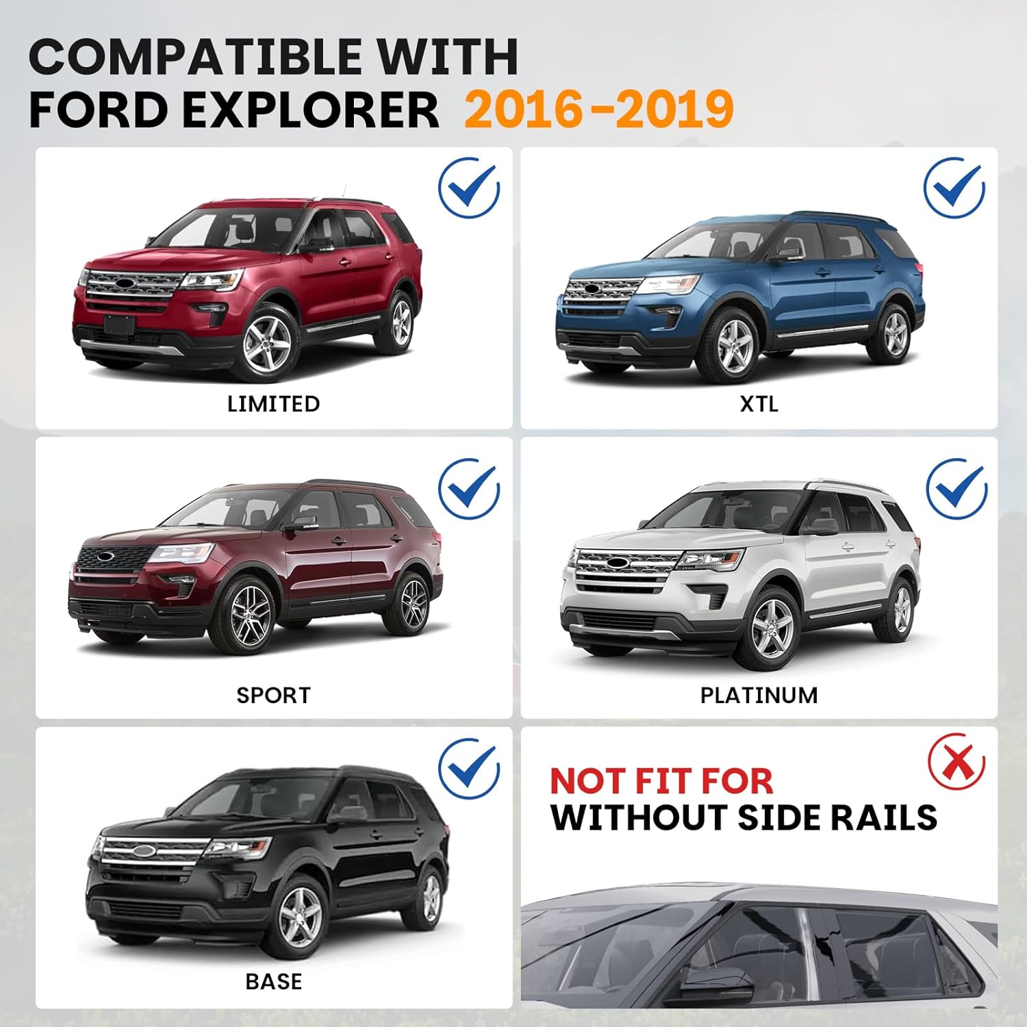 Vehicle Compatibility: Fits Ford Explorer 2016 2017 2018 2019 Base/ XLT/ Limited/ Sport/ Platinum (Not fit for Escape/ Edge and other models). Please verify your vehicle’s configuration before purchasing