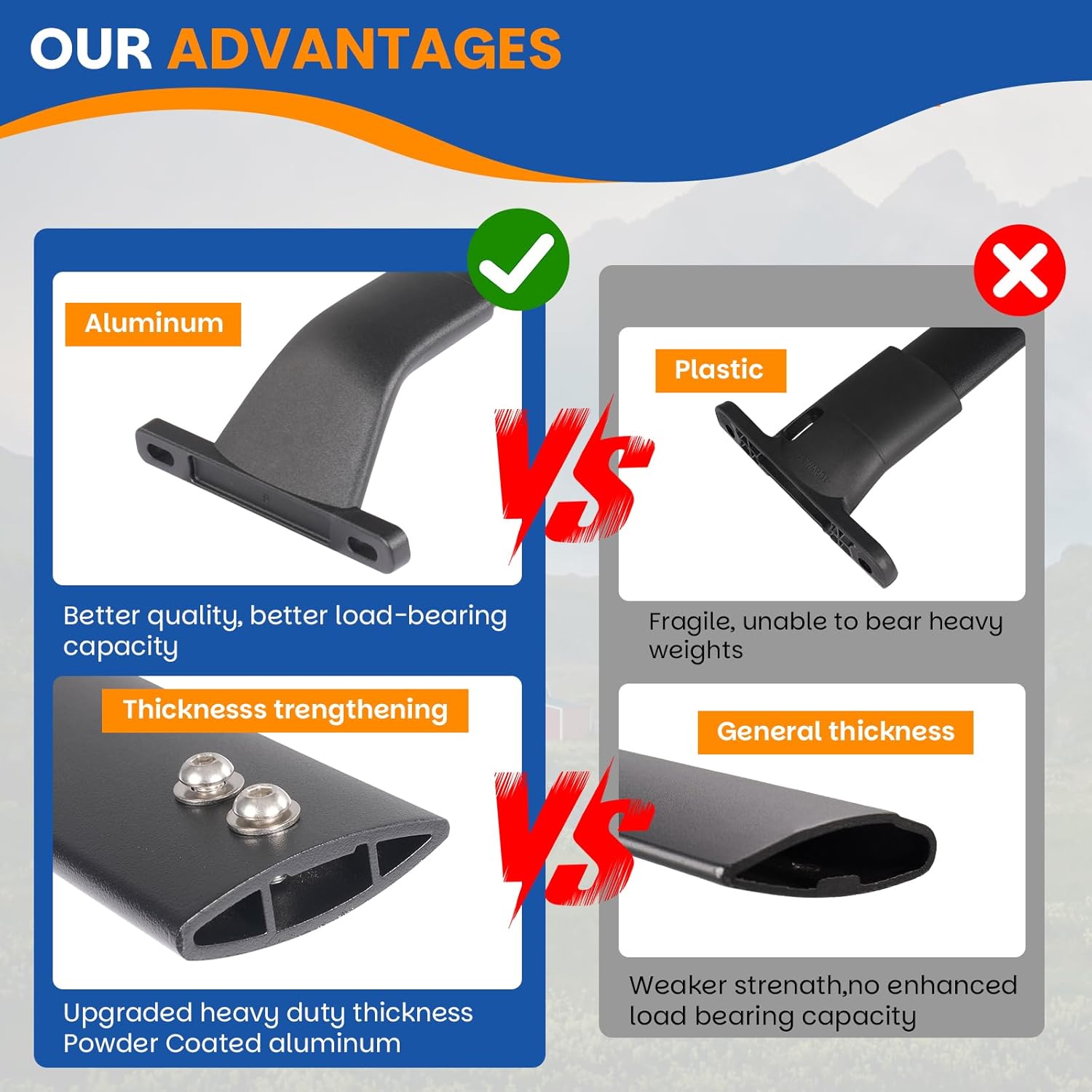 Max Load Capacity: Supports a maximum load of 220 lbs (100 kg) when the force is evenly distributed. Perfect for outdoor activities, camping trips, Kayak, Luggage Carrier, Bike Mounting Rack, Snowboards, Roof Bag, Canoe, Cargo Basket and other rooftop accessories and transporting sports equipment, modular designs offer flexibility, making it a versatile addition to your vehicle