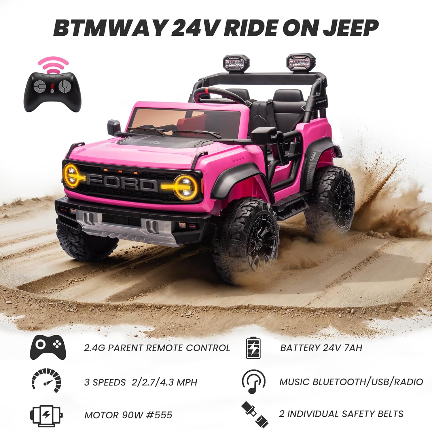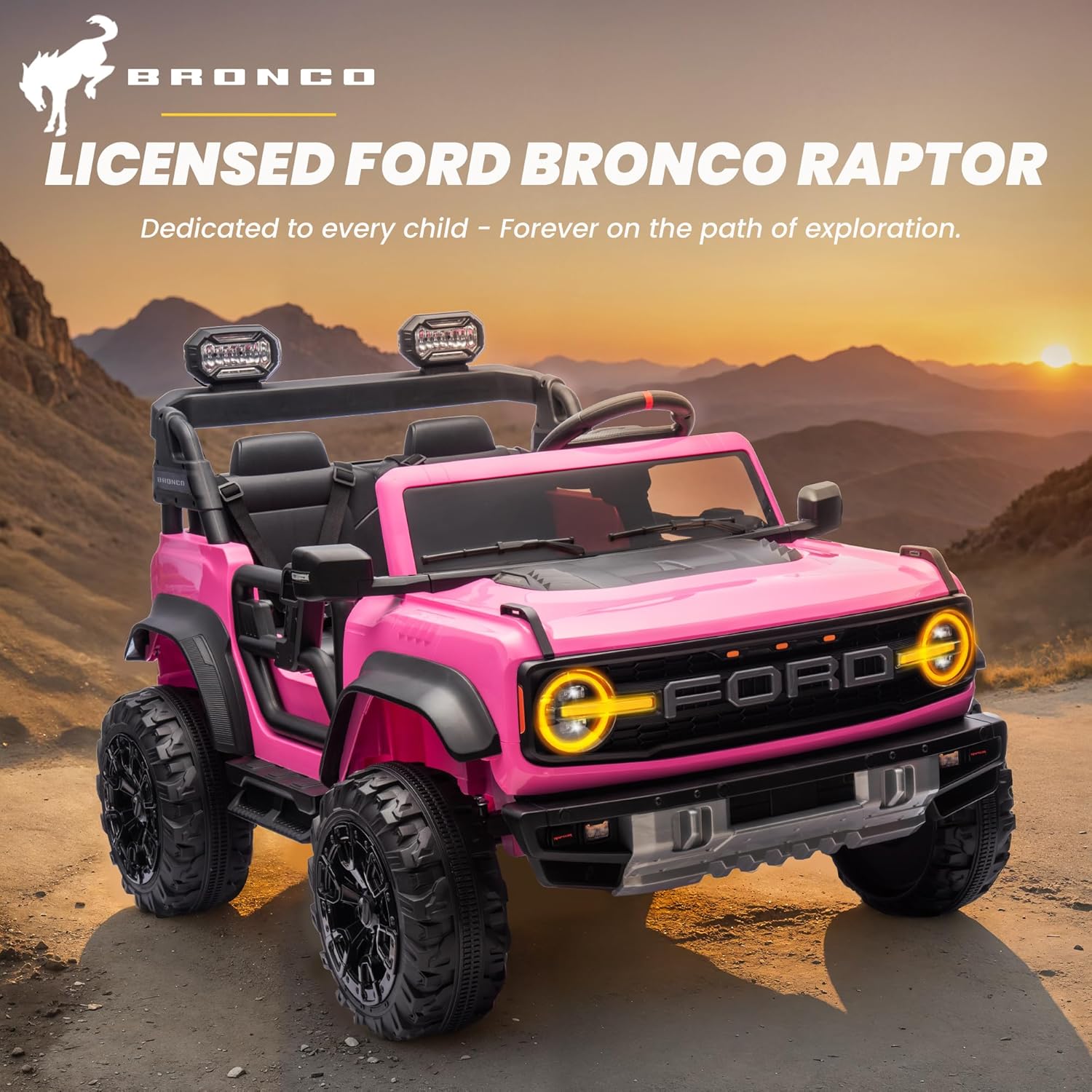 24v Ride On Toy for Big Kids,2-4.3 Mph,Ford Bronco Raptor Licensed Electric 2 Seater Ride On Car with Remote Control,Off-Road Wheels,Bluetooth Music Player,Spring Suspension,Safety Belts,Pink