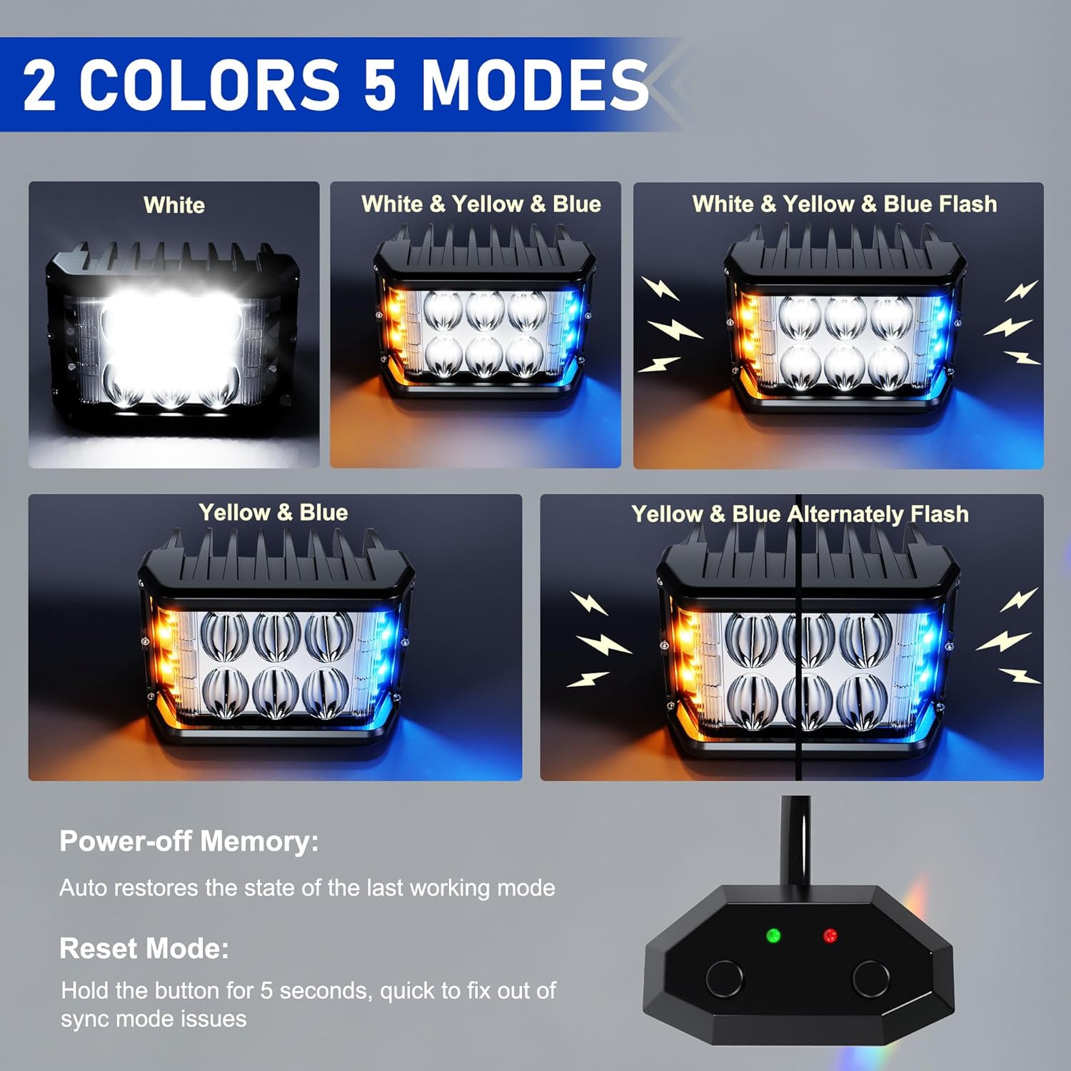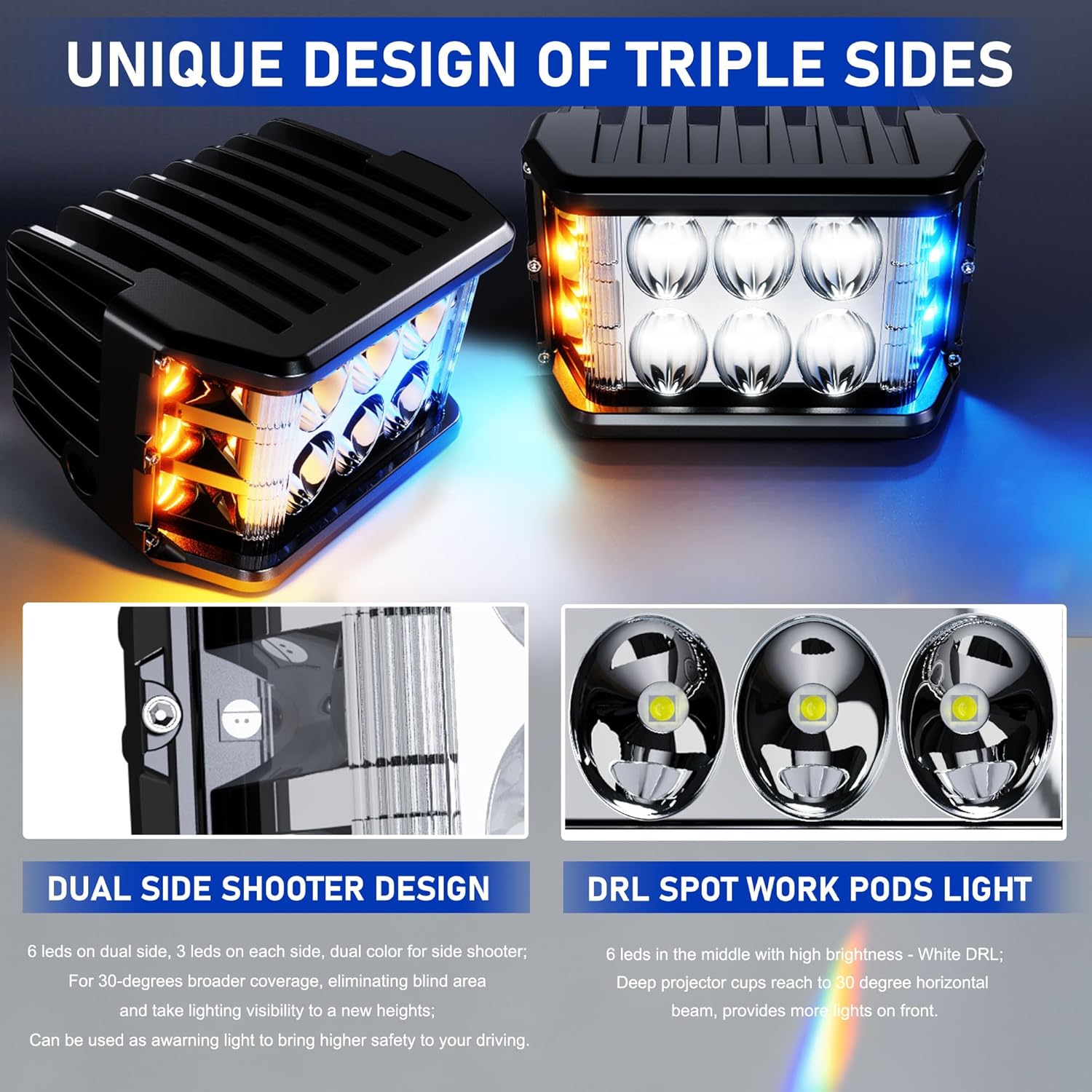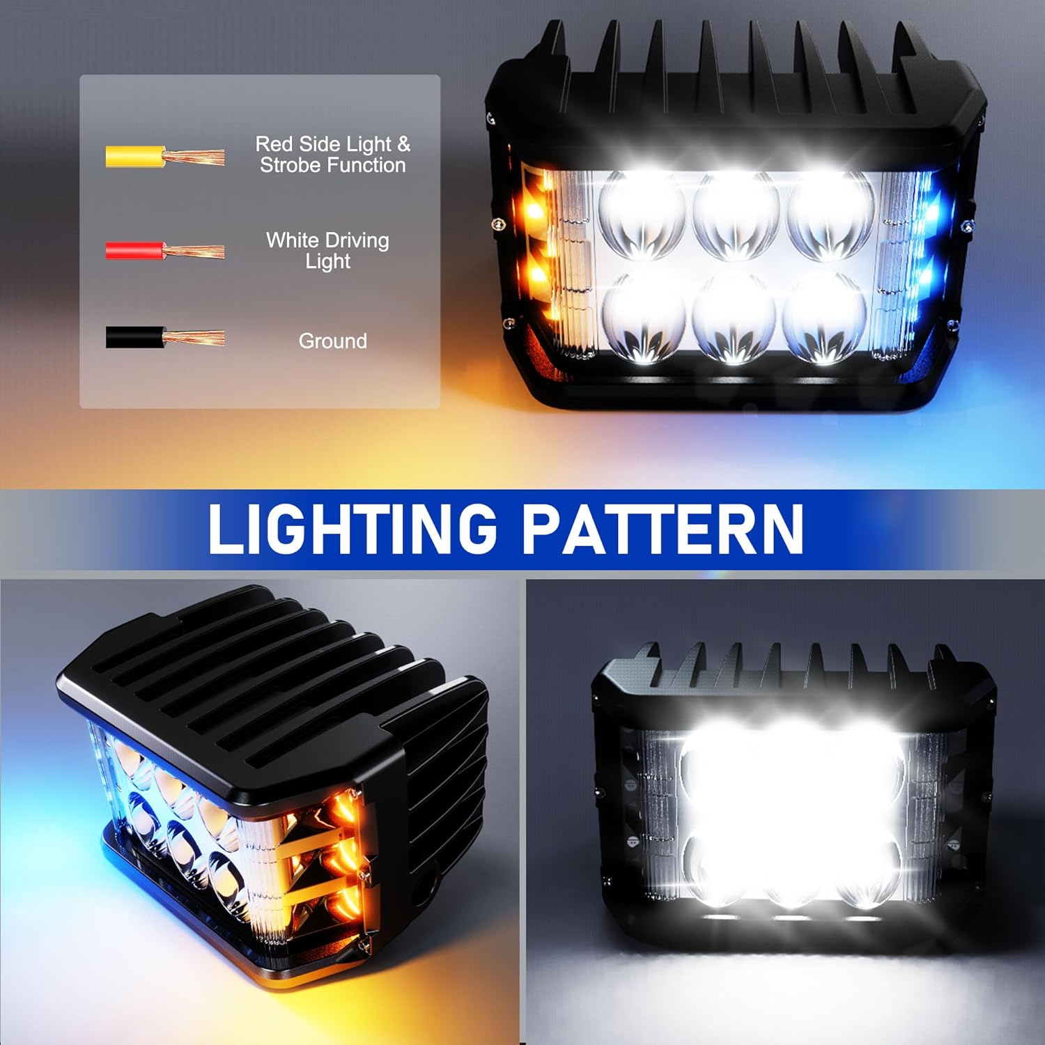 【Upgrade Lighting】 6000K bright cool white spot daytime running lights & yellow & blue strobe fash function(3000K yellow & blue side shooter). Separated the Strobe function and Solid function. Super bright lights output, can make you see the road ahead and on both sides clearly while you are driving.