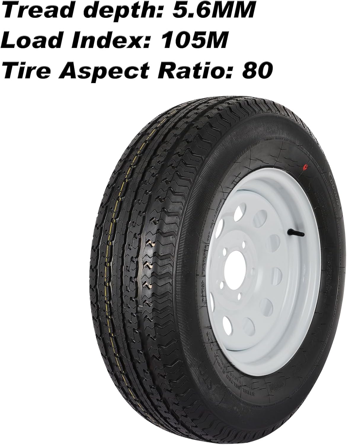 Trailer Tire Sets, tires with rims. The rubber is constructed with a double steel belt for additional strength and vehicle towing capability.