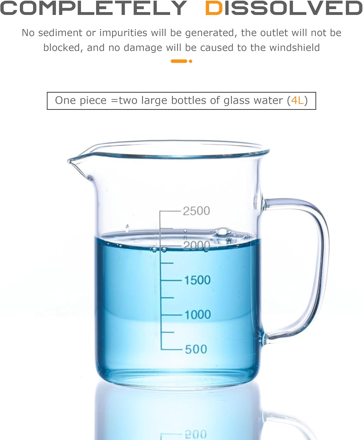 [Complete Dissolution]:It takes about twenty minutes for the solid concentrated cleaning tablets to completely dissolve.No sediment or impurities will be produced,and the water outlet will not be blocked.It will not cause any damage to windshield,car paint,etc.