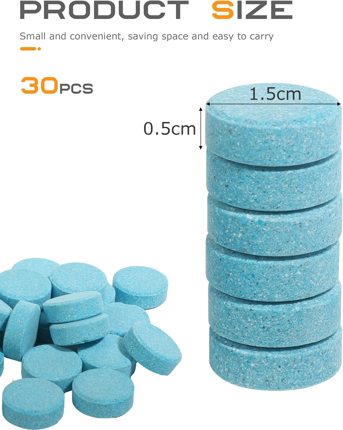 [Package List]:The package contains 30pcs windshield washer tablets,measuring only 15mmx2mm.Compared with traditional laundry tablets,they are easier to store,more compact and portable,can save a lot of money,and will not take up too much of your space.