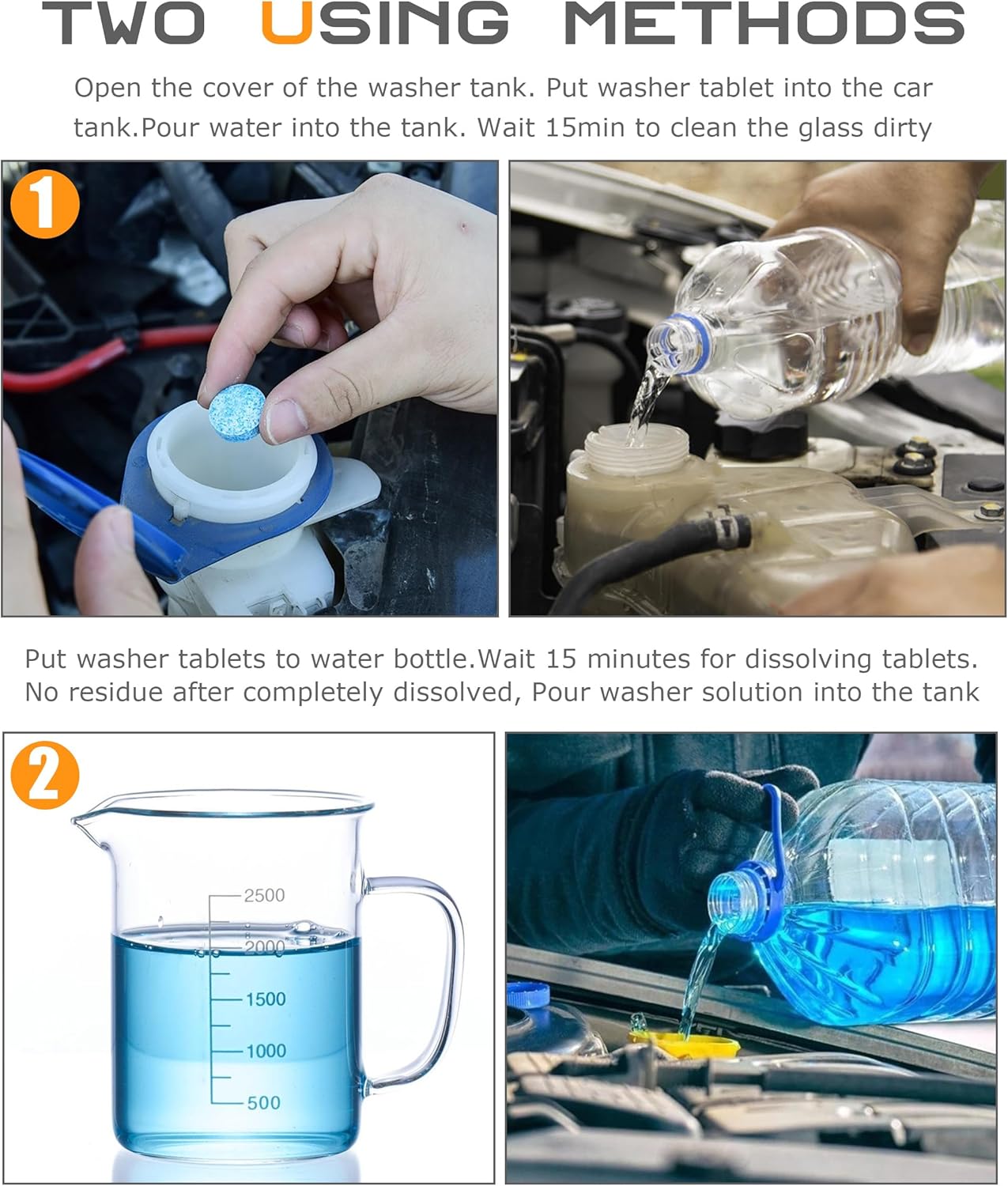 [Easy to Operate]:Just open the water tank cover,pour water into the water tank,and put in a wiper fluid tablet.The operation is simple and no complicated steps are required.Wait 15-20 minutes and then turn on the wipers to clean the windshield.