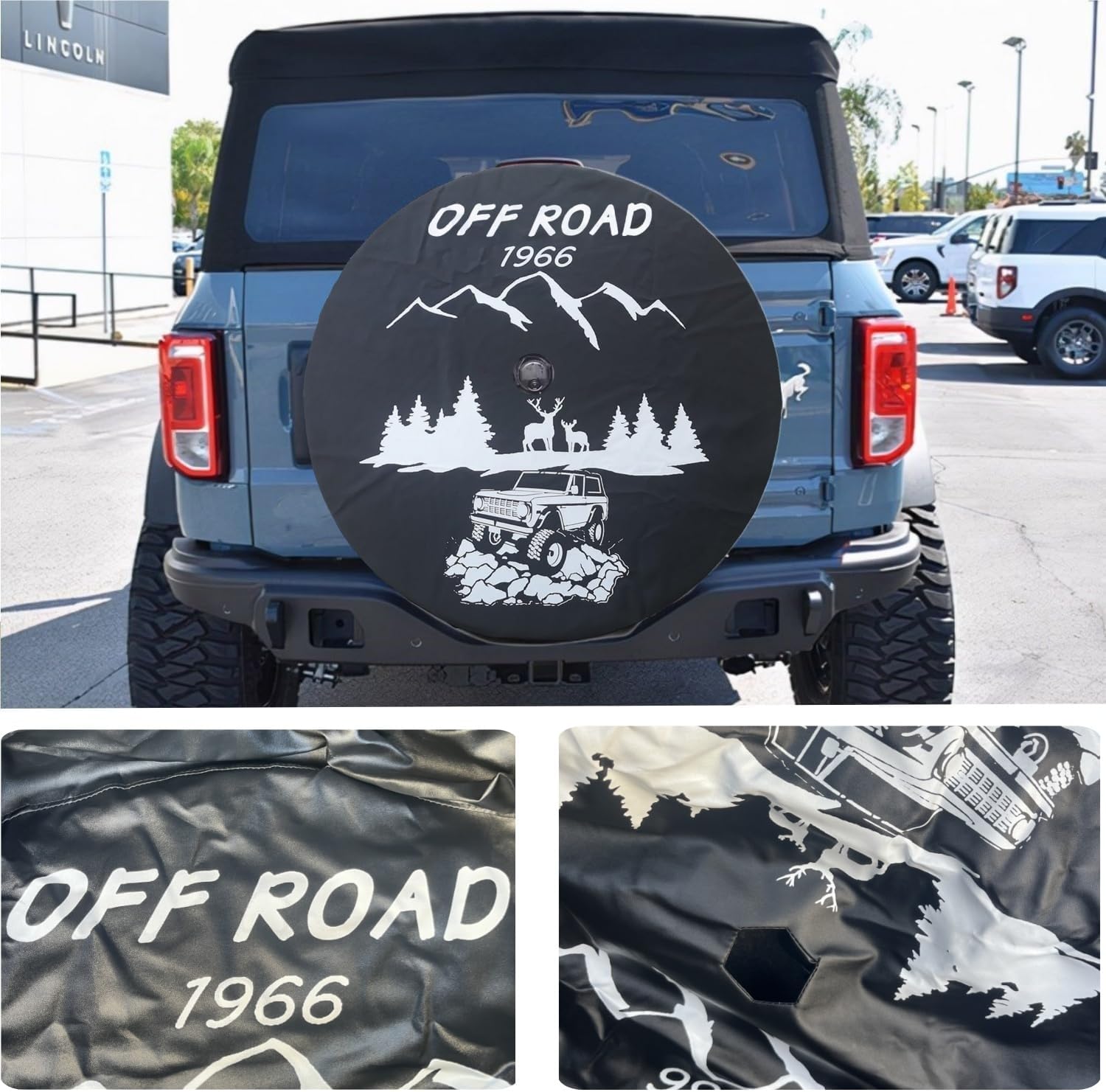 【Fitment】Spare tire cover is perfectly suitable For Ford Bronco 2021 2022 32-inch Bronco tires.Reserved holes for the rear camera of the original car, which does not affect the use.