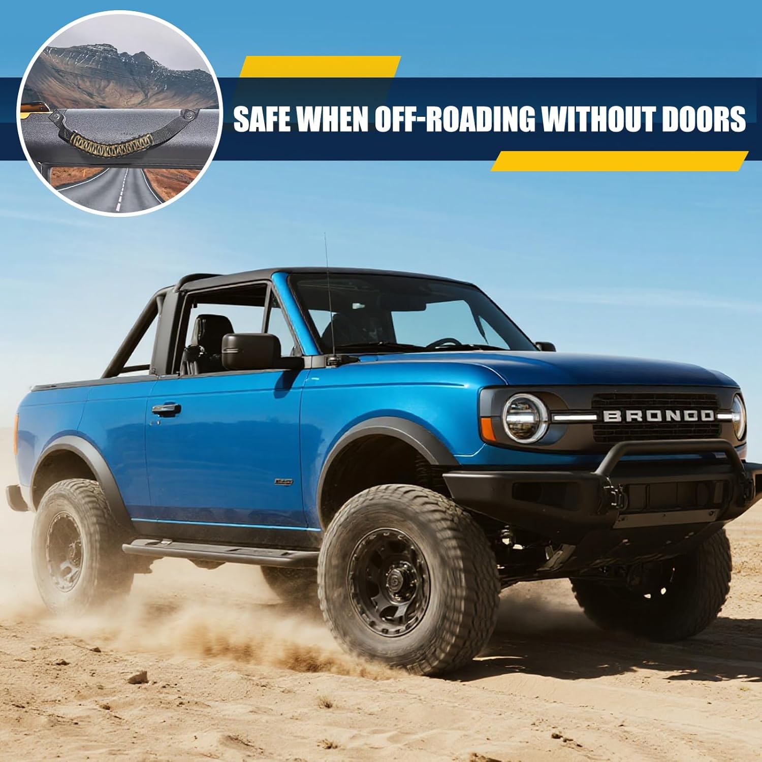 Enhanced Safety for Off-Roading: Our bronco grab handles provide a reliable grip when you’re off-roading without doors. They assist in safely getting in and out of your Ford Bronco while ensuring that they do not interfere with the vehicle’s airbags, making them essential ford bronco accessories for adventurous drivers.