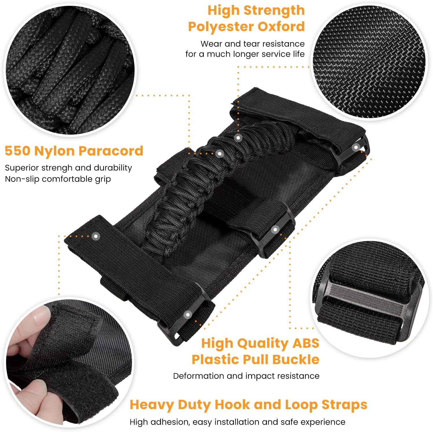 Superior Material — Premium grade durable 550 nylon paracord handle and high strength polyester oxford, anti-wear and anti-tear for long-lasting reliability. High quality automotive ABS plastic pull buckle with heavy duty hook and loop straps, anti-deformation and anti-impact for safe experience. Withstand a pull of 400 pounds.