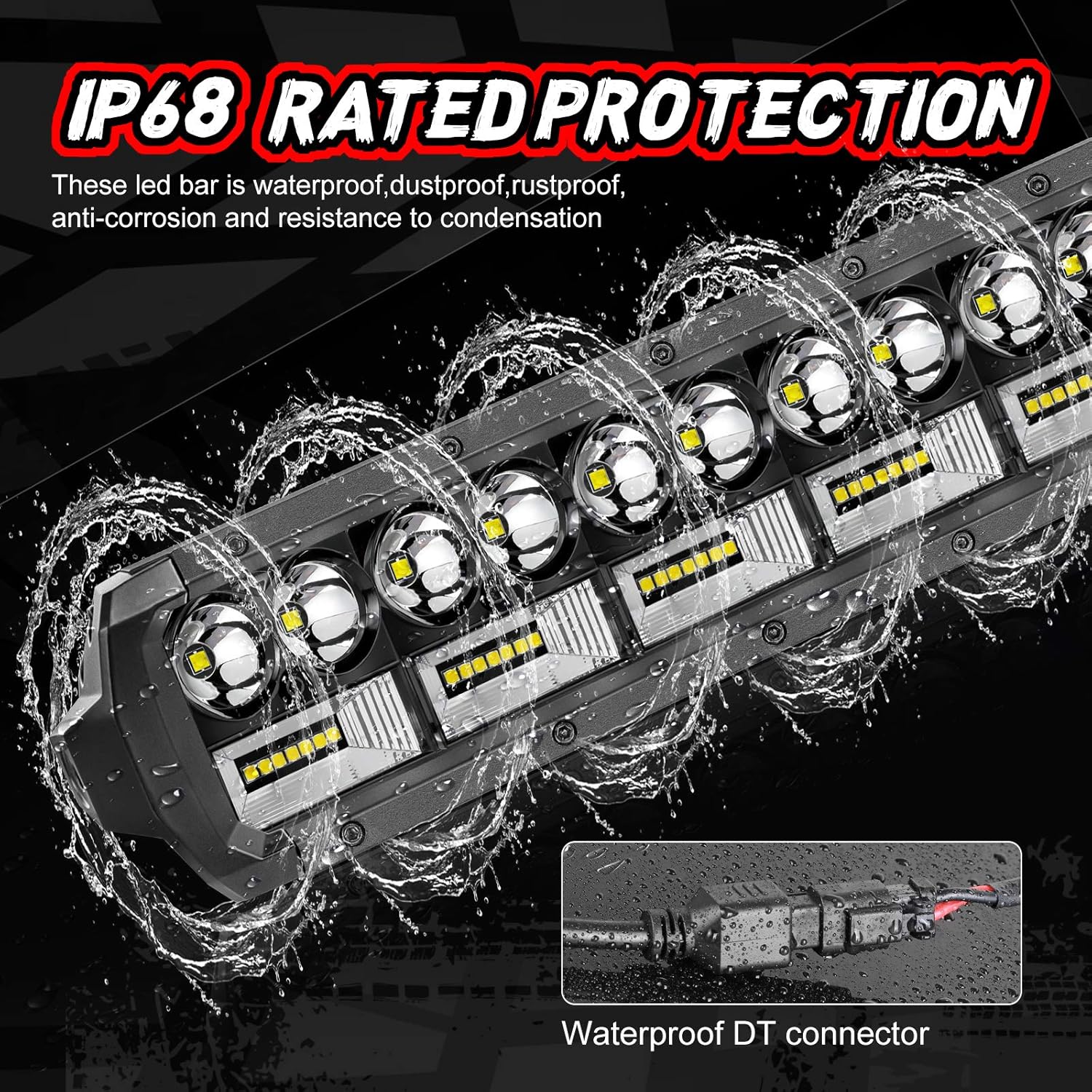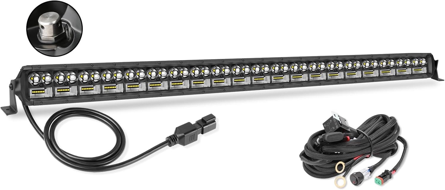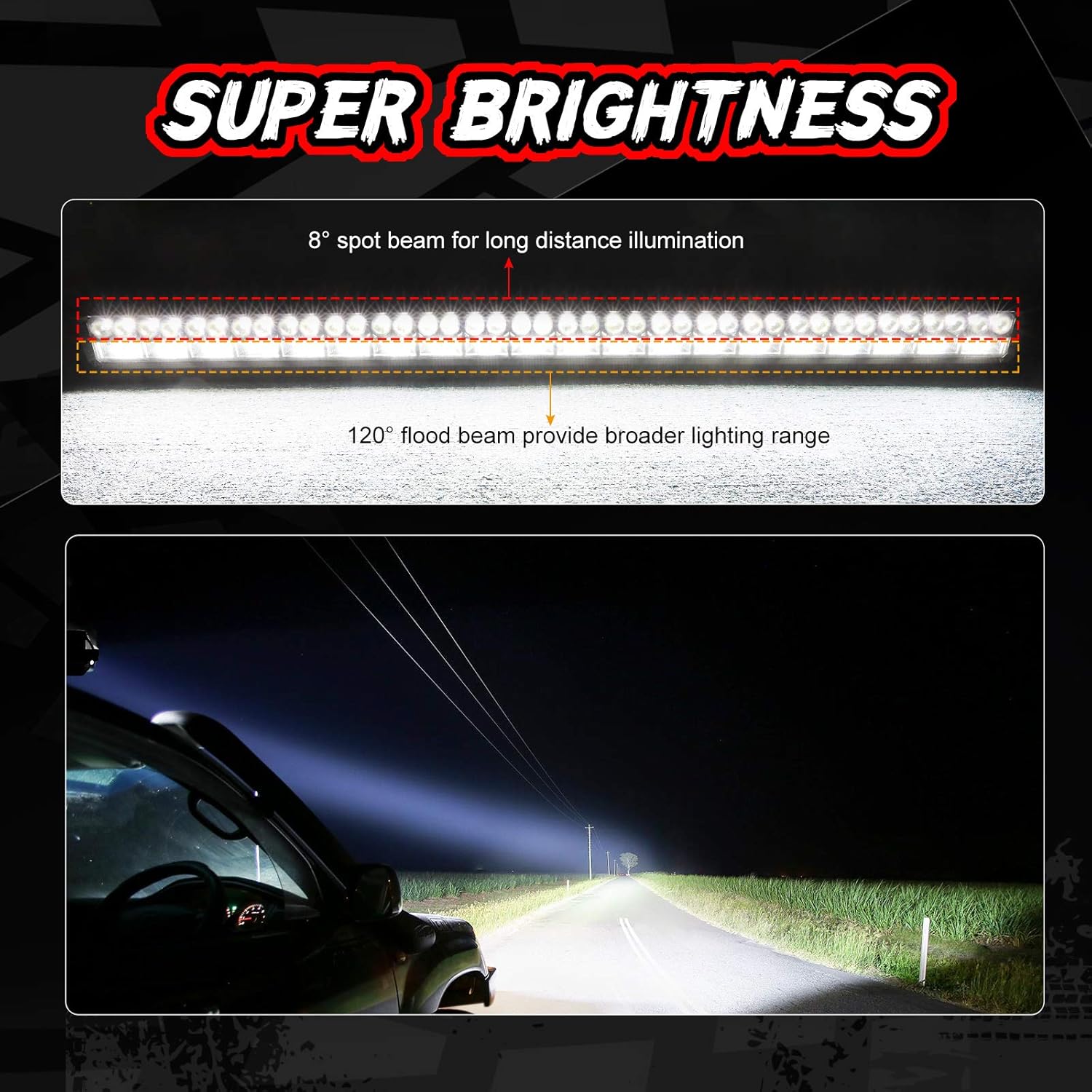 PERFECT COMBO BEAM – This 40 inch dual row light bar features perfect 8° spot & 120° flood combo beam, the upper LEDs design as spot beam pattern provides extremely focused light, provide clear view on long distance so you can be aware of what’s ahead and plot the route accordingly, while the lower flood beam pattern offers wide and narrow beam of light that are perfect for illuminating large amounts of space.