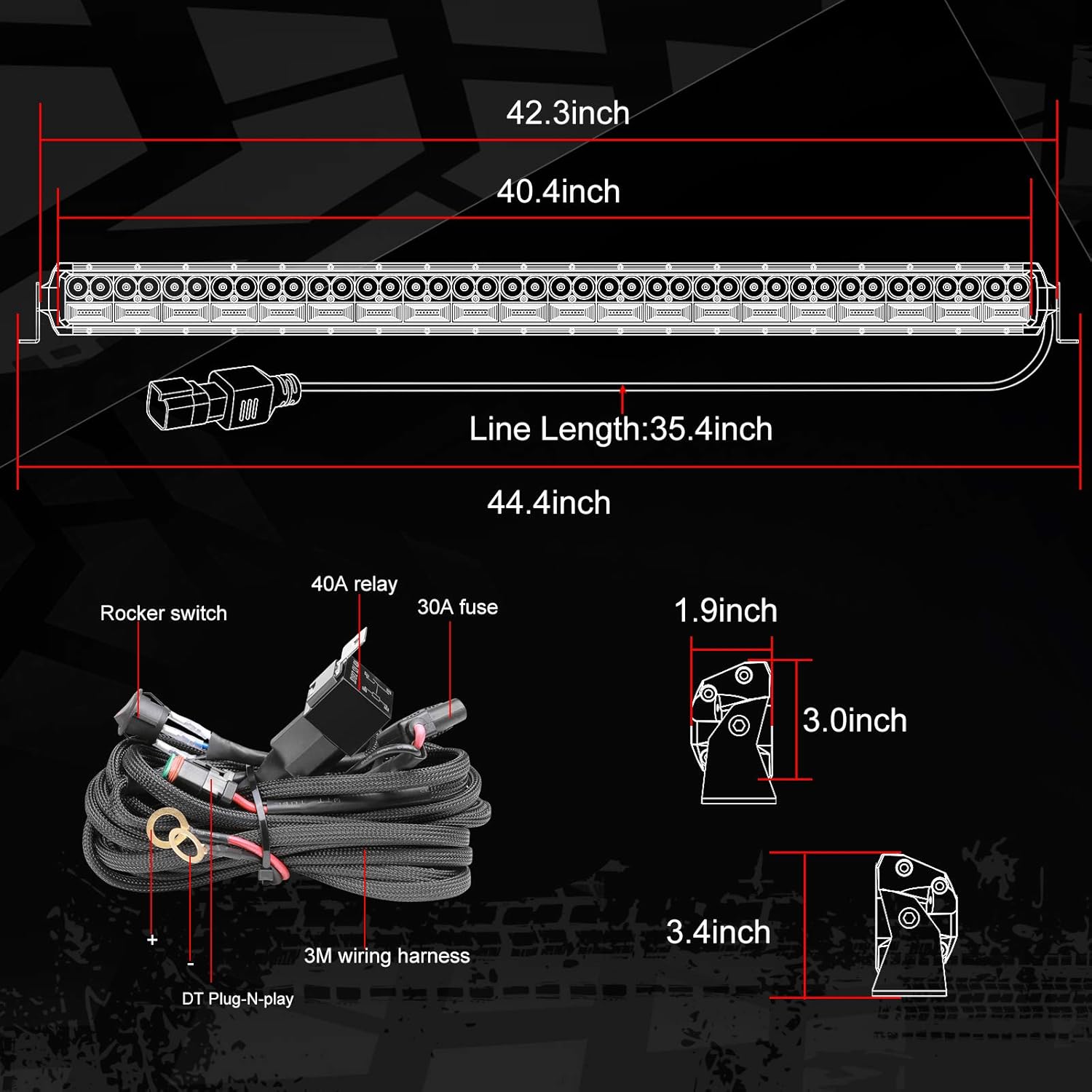 PACKAGE INCLUDED – 1Pcs 40 inch led light bar +1 set wiring harness with plug and play DT connector, in-line fuse and toggle switch+2Pcs side mounting brackets, it can be adjusted + mounting hardware kit. We provide 2 years quality guarantee and 24 hours online after-sale service.