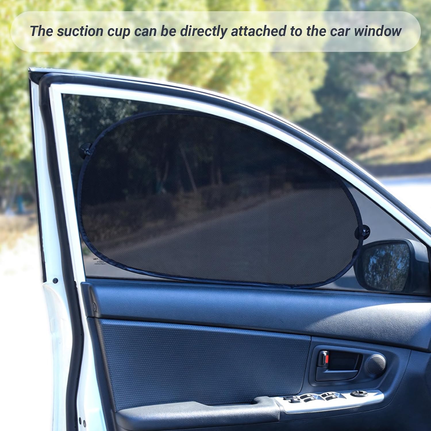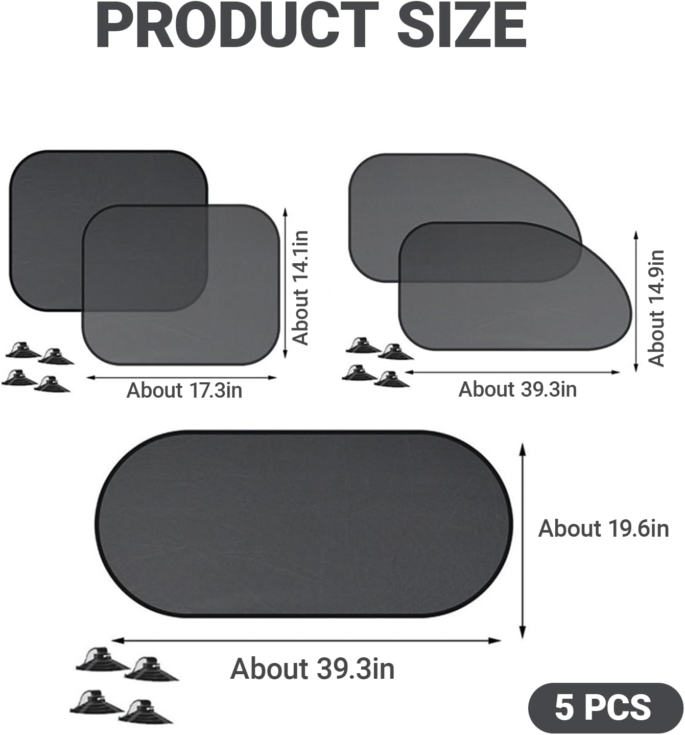 Packaging Details: Package includes 1 piece 39.3″ x 19.6″ rear windshield sunshade, 2 pieces 25.5″ x 14.9″ front side window sunshades, 2 pieces 17.3″ x 14.1″ rear side window sunshades, 12 suction cups. The front window sunshade cover is designed with a hole. Just insert the suction cup directly into the hole.
