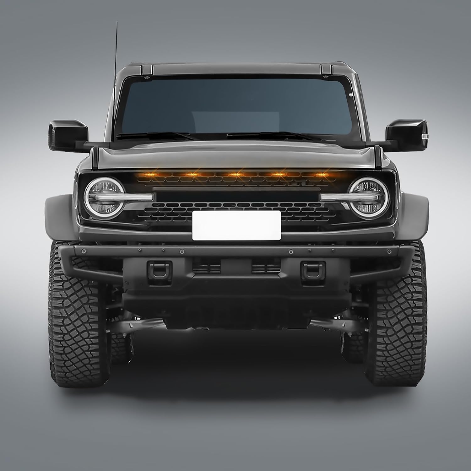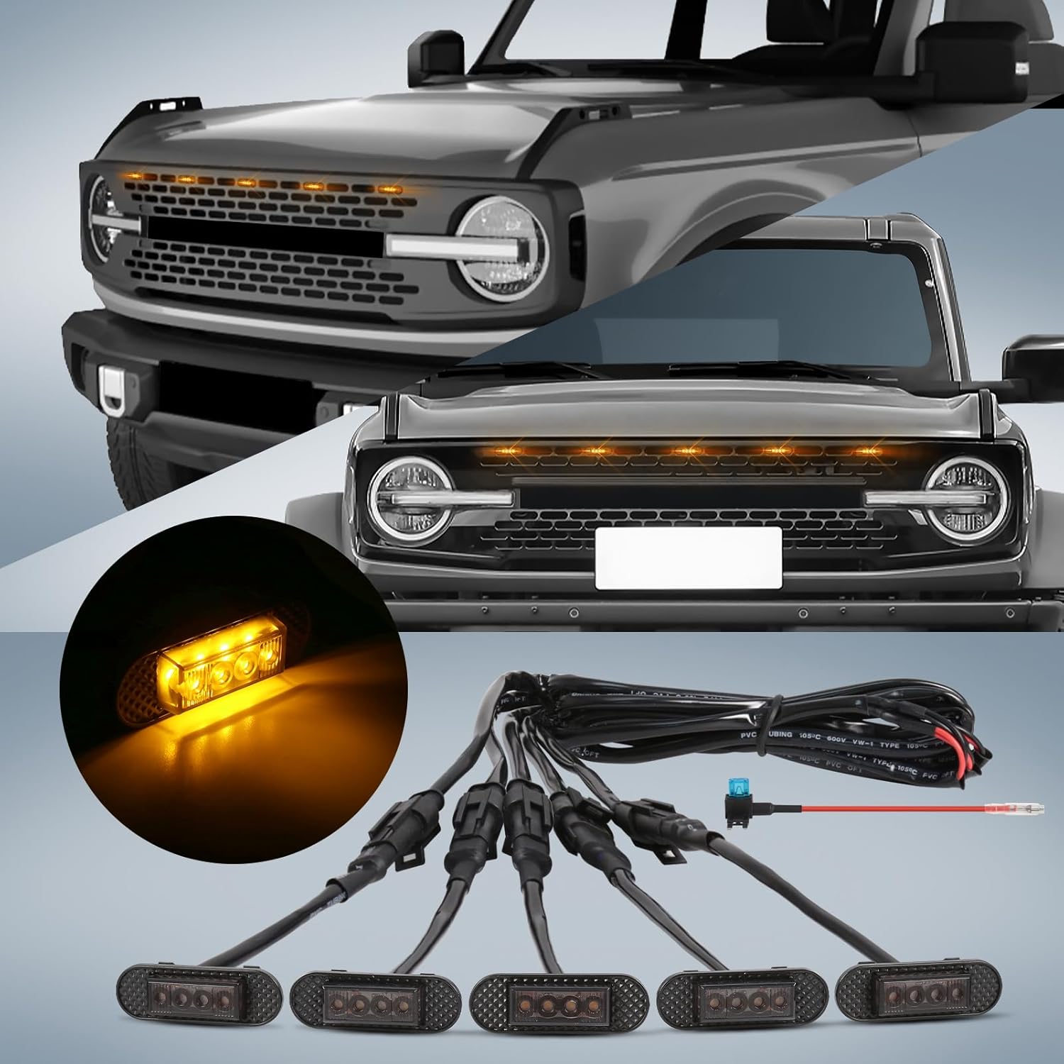 5 Pcs Grille Lights Compatible with 2021 2022 2023 2024 Ford Bronco Badlands, Wildtrak, Everglades 2/4-Door – LED Front Grille Lights Accessories with Harness & Fuse(Amber Light)