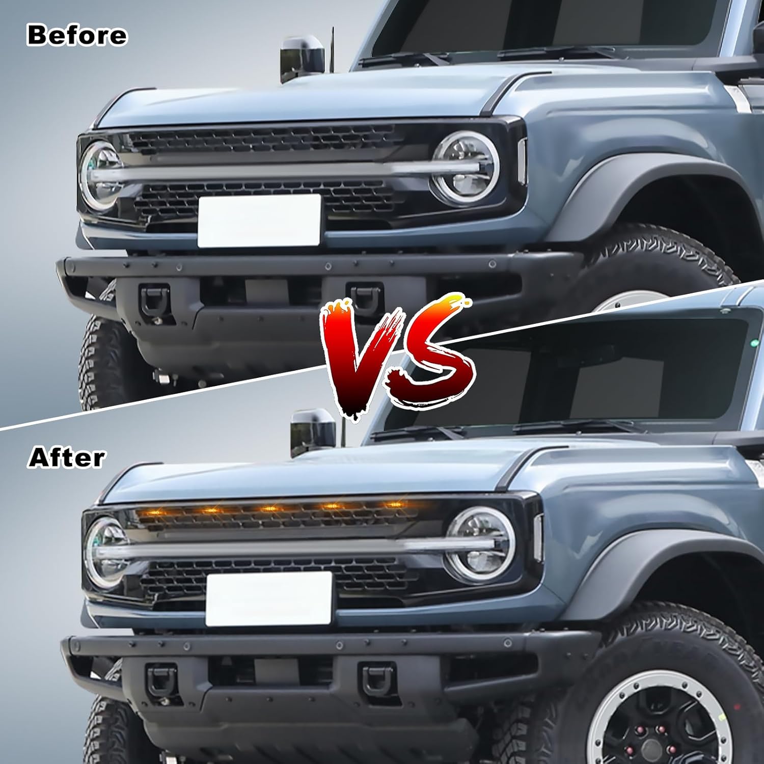 Easy Install for Plug-and-Play & No Drilling Required: The grille lights for Ford Bronco easily snap into the front grille for 20 minutes finish mounting. Light and Wire for Plug-and-Play & Grille for No Drill.
