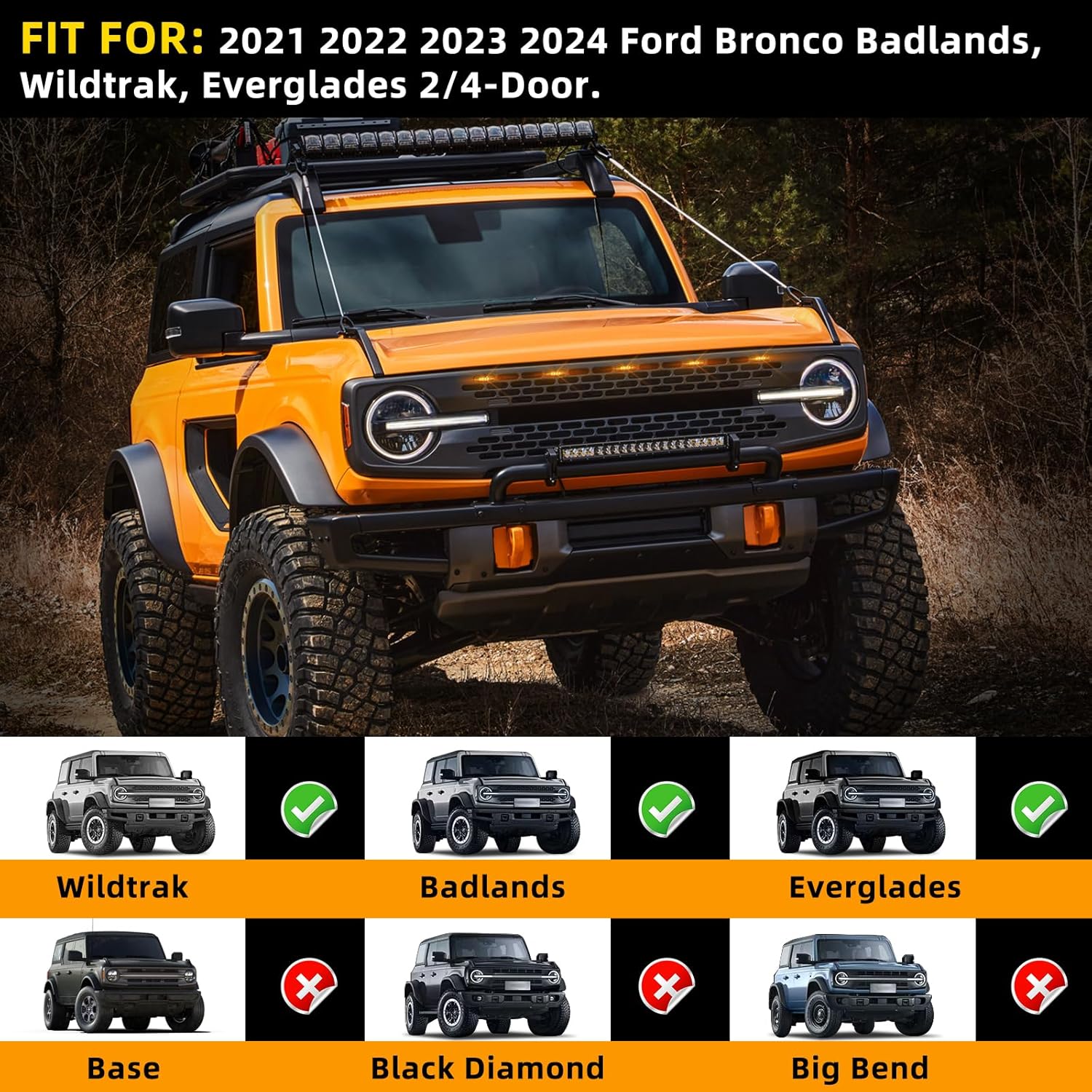The lights are only fit for 2021-2024 Ford Bronco 2/4-Door Badlands, Wildtrak, Everglades, but not fit for Bronco Sports, Base, Big Bend, Black Diamond, Outer Banks, Raptor.