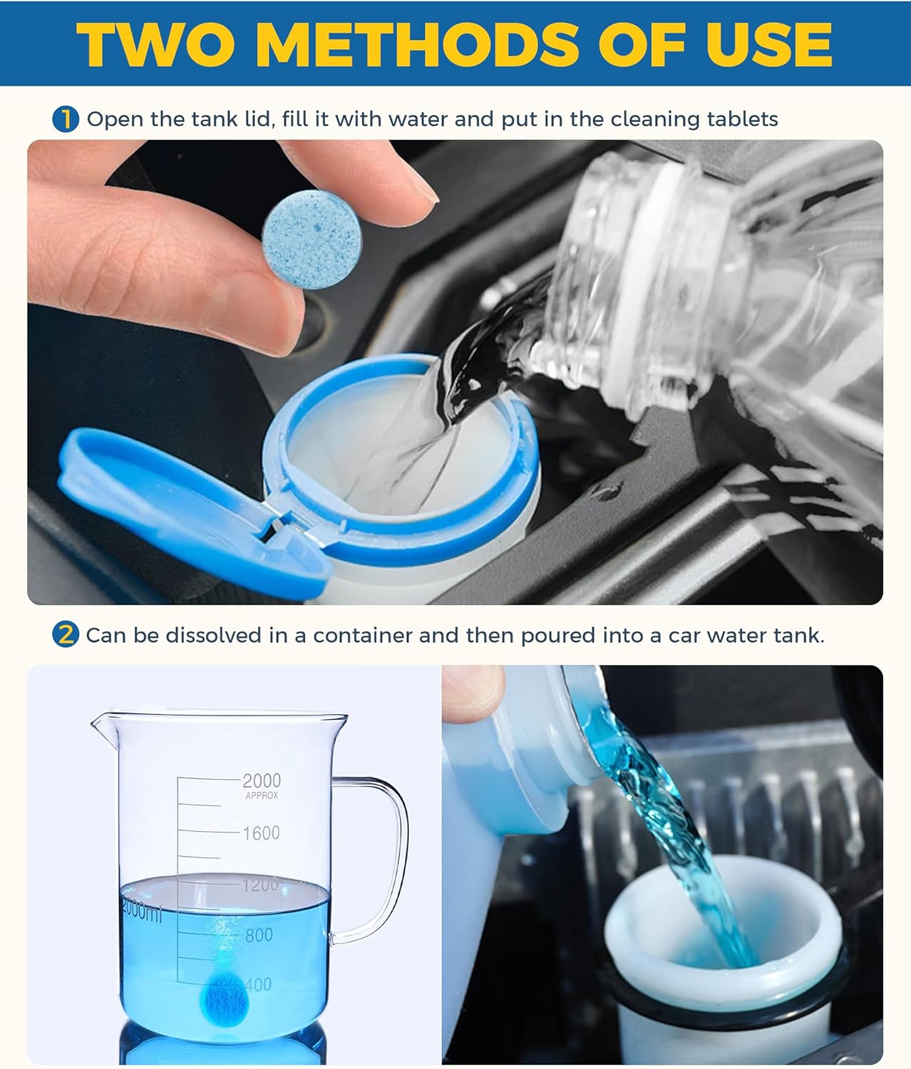 [Instructions] Method 1: ① Open the water tank cover. ② Pour water into the water tank. ③ Put a washing tablet into the sink. ④ Wait for 15-20 minutes, then start the wipers to clean the windshield. Method 2: ① Drop one tablet into a water bottle. ② Wait for 15 minutes for it to completely dissolve Ensure complete dissolution without any residue. ④ Pour the dissolved liquid into the tank.