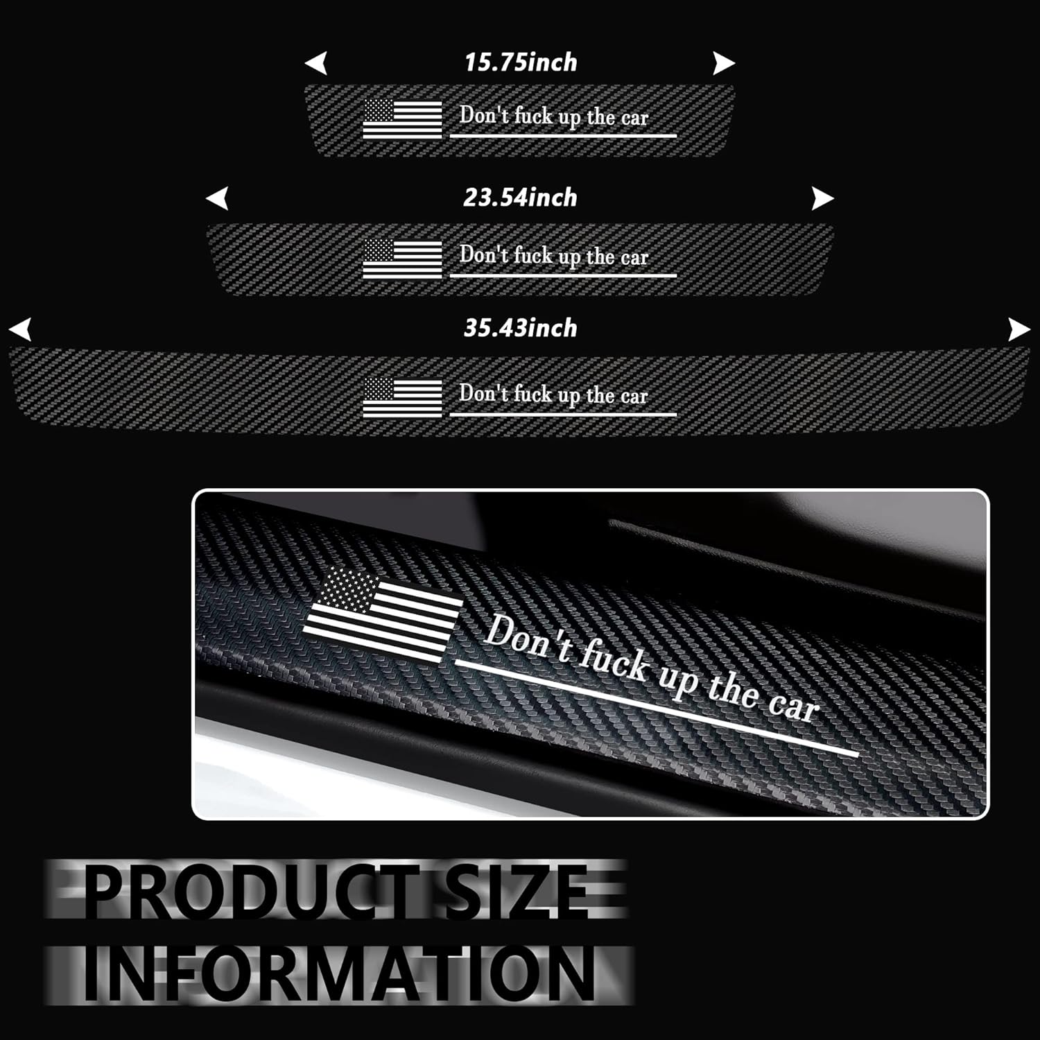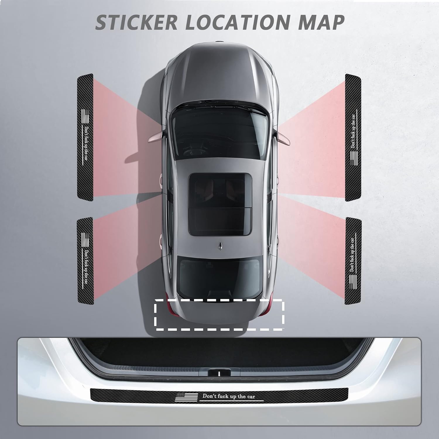 • 🚗Perfect after sales:5PCS car door threshold stickers (2 front doors, 2 rear doors,1 × trunk door sill).Please note! This product is not suitable for sticking on plastic surface (plastic products affect the adhesion). Suitable for pasting on iron/aluminum body surface. Please confirm the position of the paste before installation.