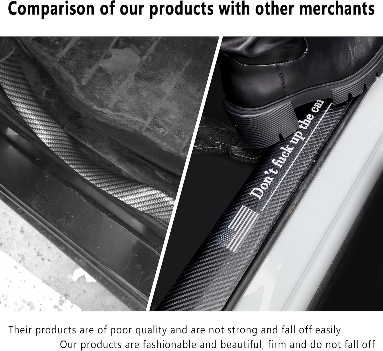 • 🚗Easy installation: 1: Clean the door sill surface to ensure that it is clean without dust and oil. 2: Tear off the self-adhesive protective film and stick it on the door sill of the car. 3: Flatten the sticker by hand to make the sticker fit in place.