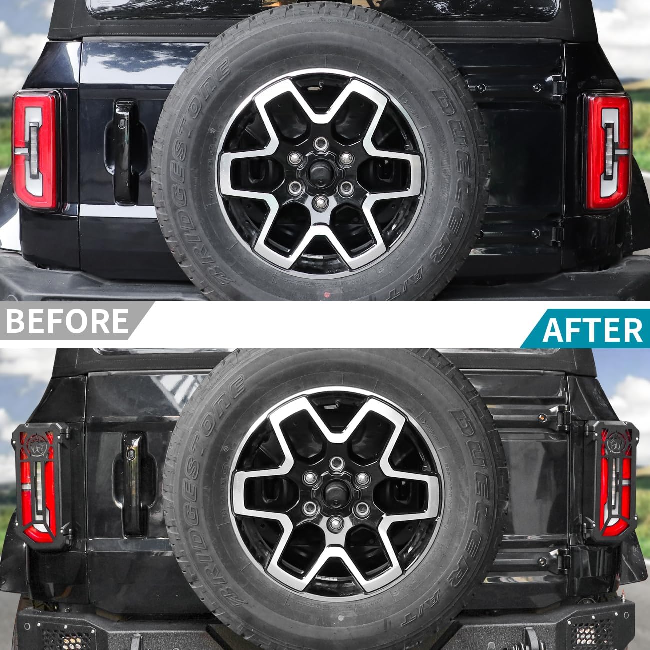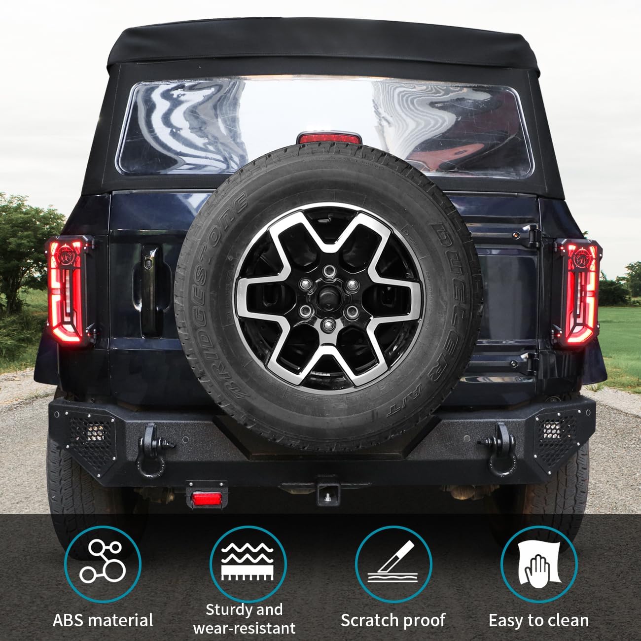 1.【 Fitment】The taillight cover is compatible with for Ford Bronco 2021 2022 2023 2024 2025 2/4 doors.(Note:Not compatible with for Bronco Sport.).Customized according to the original car,with precise 3D scanning data,ensure perfectly fits your car,with a hollow out design to ensure that it does not affect the function of the LED taillights.