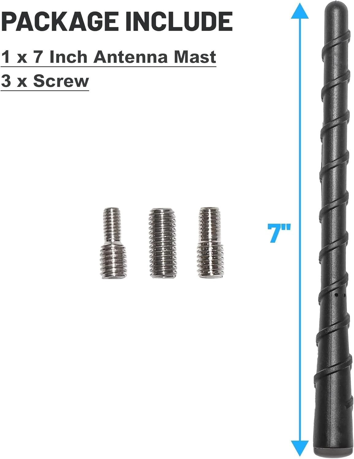 The package includes 3 x screws of different sizes to meet different needs. Installation of the antenna mast is very simple and can be done without the use of any tools. Simply requires a wrench to remove your factory antenna and a snug twist to install the 7″ antenna.