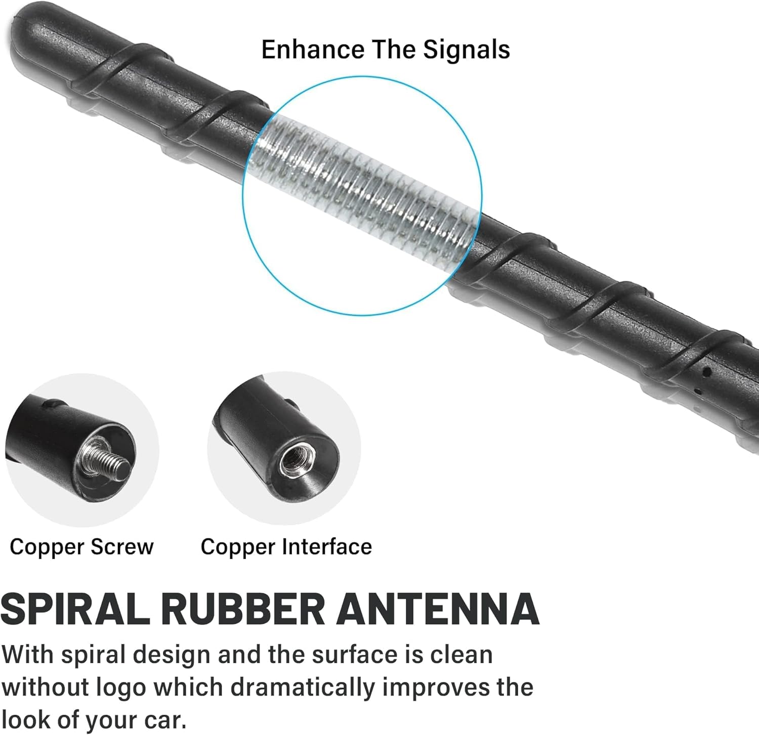 Copper core antenna, reduce signal loss inside. Antenna surface is clean without logo which dramatically improves the look of your car.