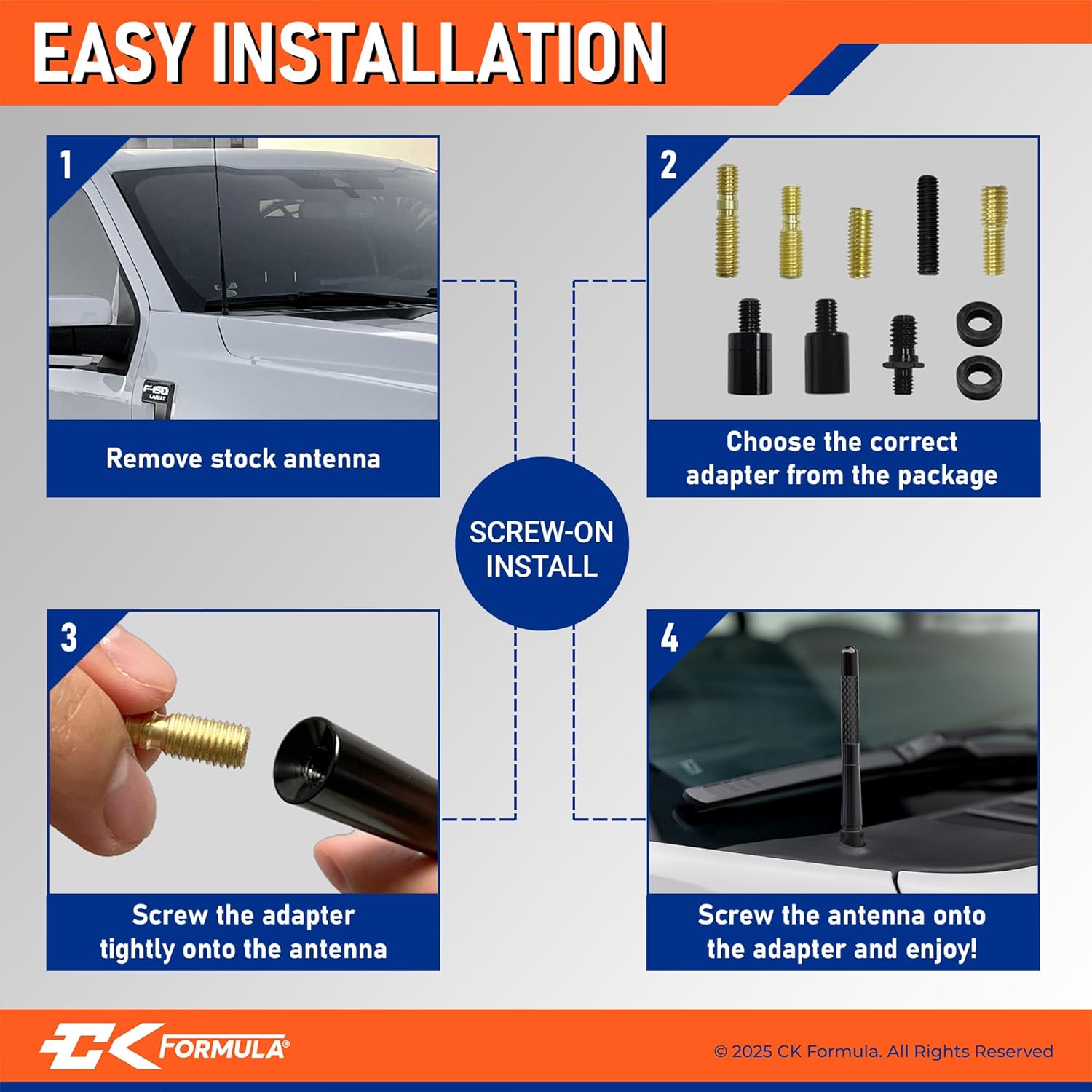Includes various size threated adapters – just unscrew the original antenna and hand-tighten the new one on your truck, SUV, or car – no tools needed!