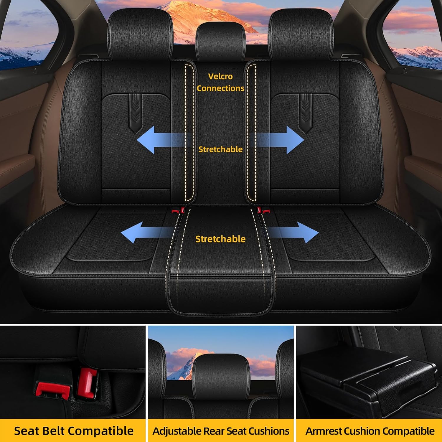 🚗【360° Protects】The back of the front headrest and the side of the seat cover are made of elastic cloth, which is elastic and 360° protects the seat from wear. The rear seat covers are connected with Velcro,it can be adjusted according to the size of the rear row of the model,and the silicone particle non-slip bottom ensures it stays well in place.