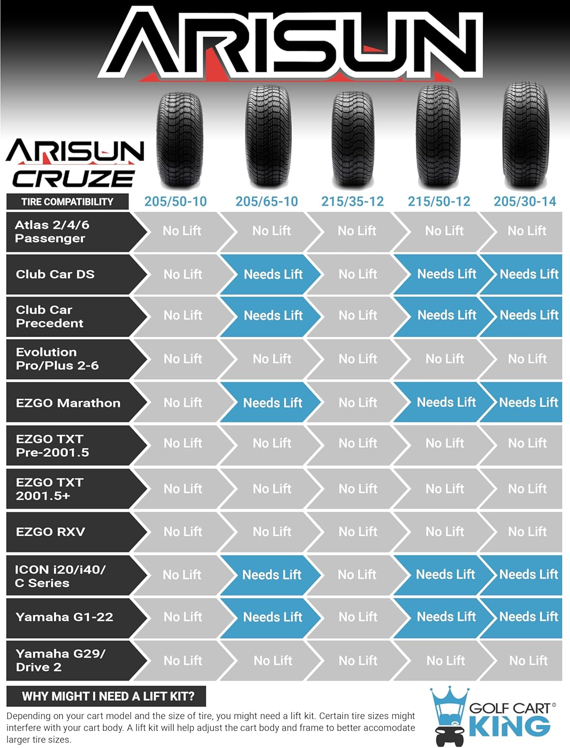 Top-Class Tires: Arisun Cruze (215/50-12) is a DOT approved, 4-ply, Street Legal Golf Cart Tire. Featuring a nondirectional and water-channeling tread pattern, these golf cart tires perform well in both wet and dry conditions. In addition, the Arisun Cruze is turf safe and street legal (DOT approved), allowing you to enjoy a smooth and quiet ride on any surface.