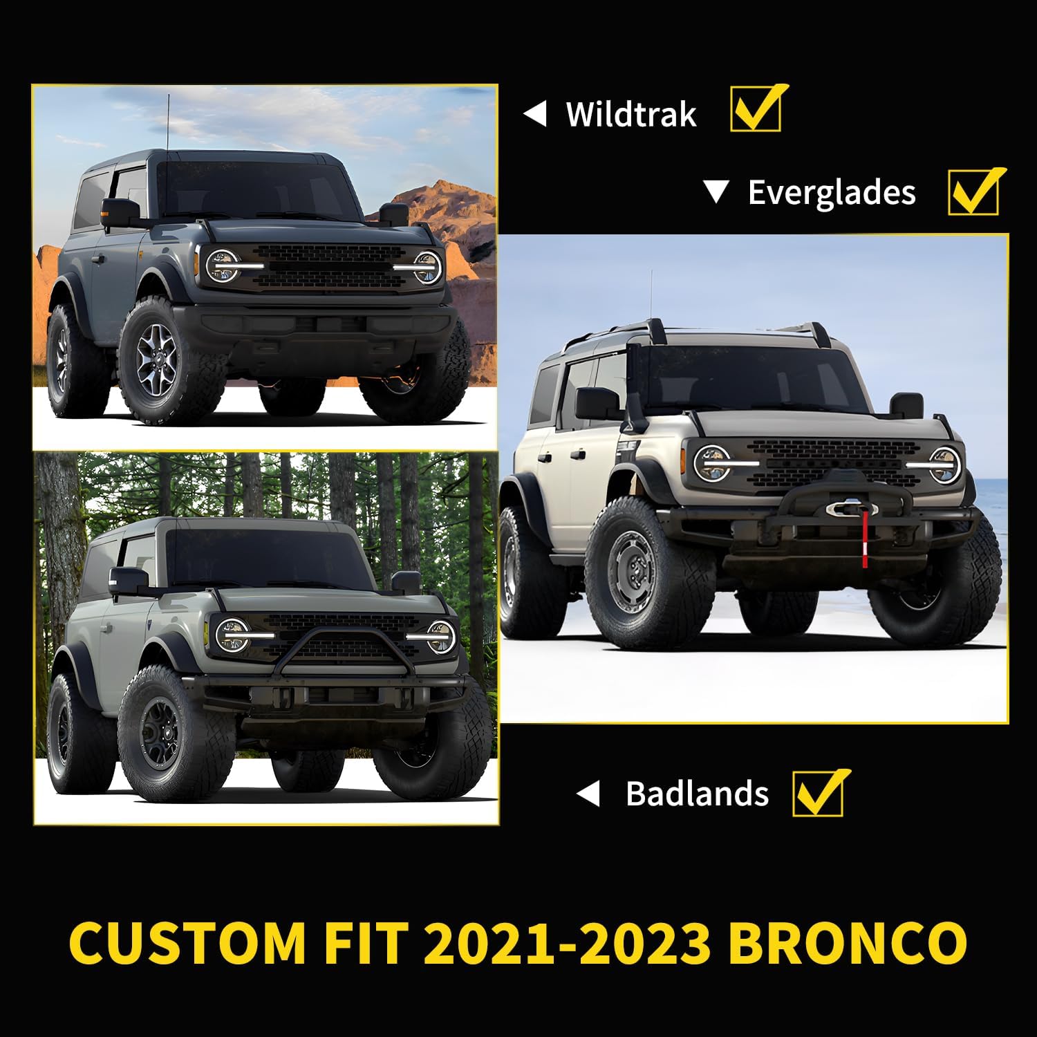 【Custom-Fit】 Fit for 2021 2022 2023 For-d Bronco: Badlands & Wildtrak & Everglades models ONLY (2/4 Doors). NOTE: Not suitable for Bronco Sport! Package include: 3* premium LED Lights + 1* Wiring Harness + 1* Fuse + 6* Cable Organizers + 3* Ties + 1* Instruction.