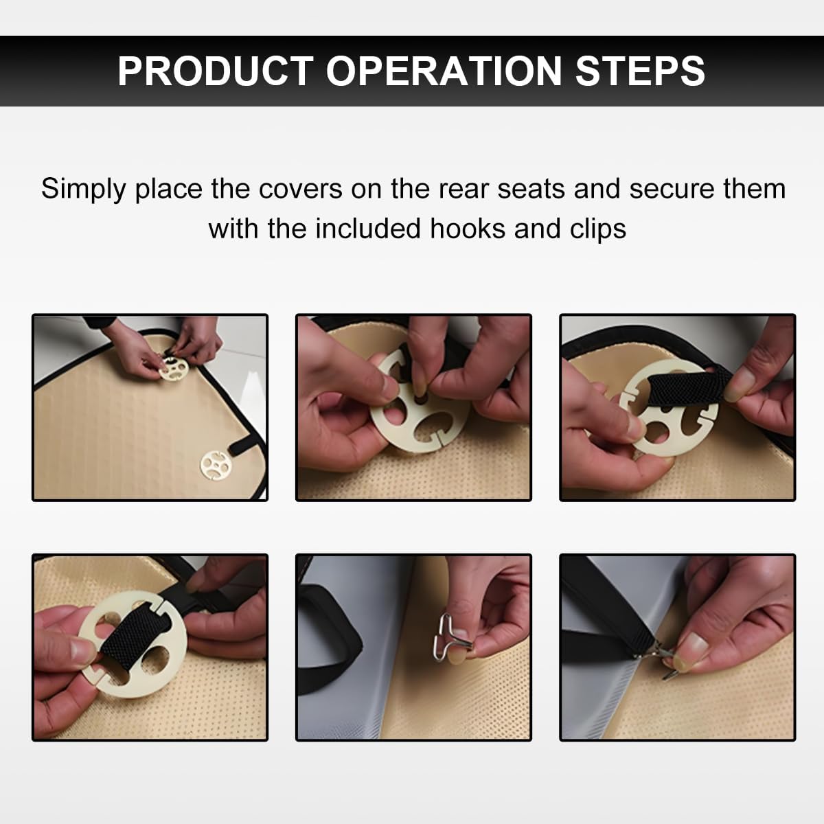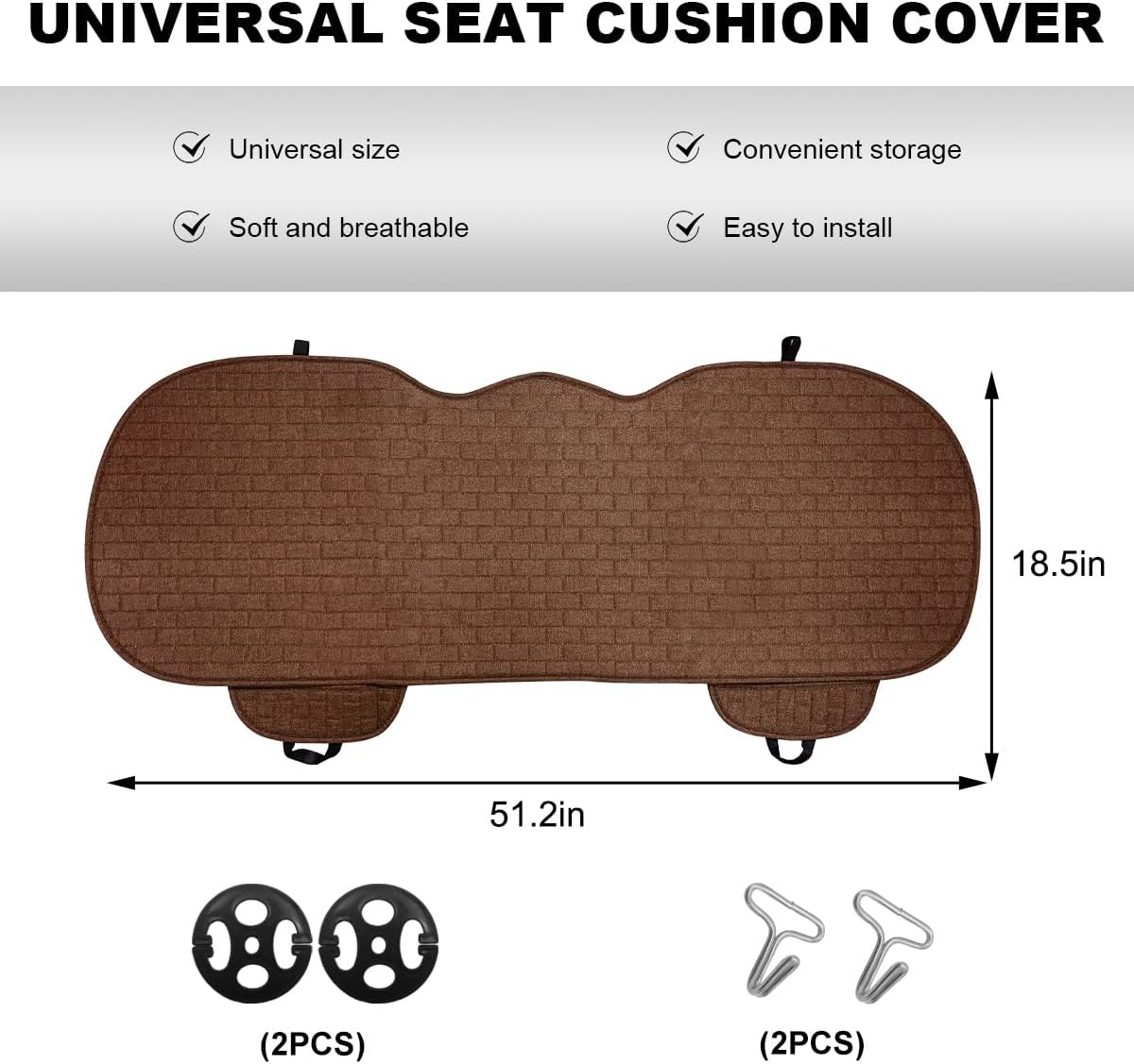 Widely Applicable: The front seat cushion measures 19.7×18.5 inches and the rear cushion measures 51.2×18.5 inches, they fit most cars, SUVs, trucks and other common vehicle seats. Simply place the seat covers on the seats and secure them with the included hooks and clips