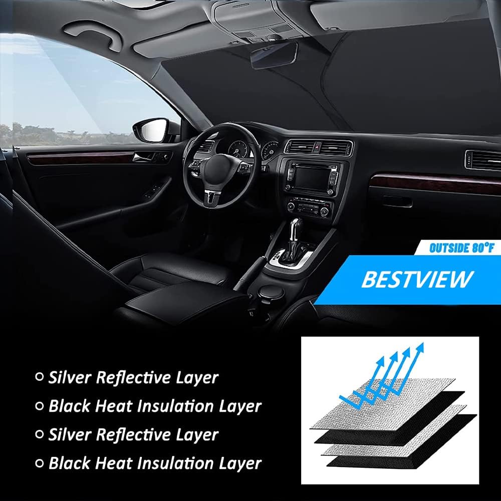 ✅【Sturdy Material】: Bestview windshield sunshade is made of 210T reflective fabric with UV reflective material, 3-layer heat insulation and 99% SPF for better heat dissipation. Design to protect car seats, electronic parts, dashboard, steering wheel and other instruments to stay cool, fully shaded and no need to worry the high temperature in summer.