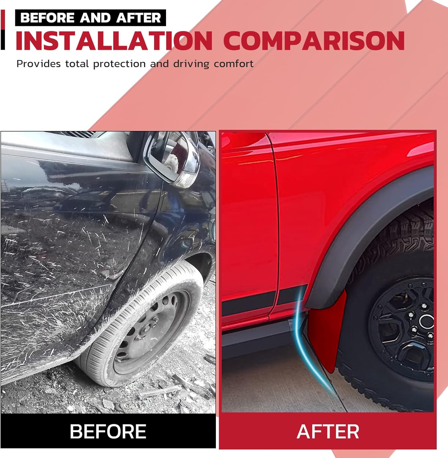 【Protect your car】These car Fenders give your car maximum protection. These mudguards protect the lower part of the car from snow, sand, rocks and other debris thrown by other vehicles,minimise the risk of dirt, road debris and stone chips flying up from the Front and rear tyres,and protecting your car is easy to clean and reduces dirt.With this product you no longer have to wash and paint your car frequently, can prevent premature rusting of auto parts, and prolong the service life of your car.