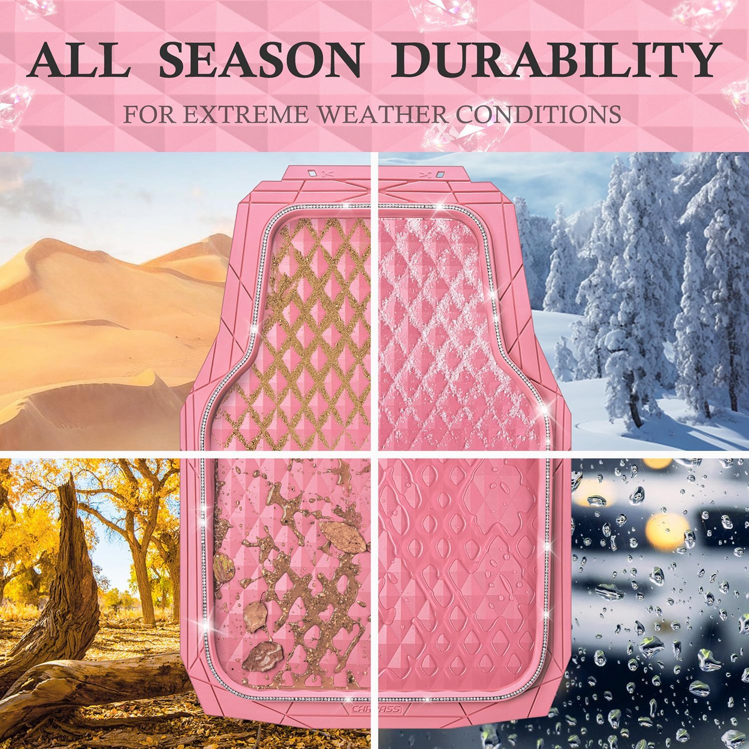 CAR PASS Bling Diamond Rubber Car Mats, Heavy Duty Deep Dish All-Weather Floor Mat Full Set Anti-Slip 3D Rhombus Waterproof Trim Fit Liner Universal Glitter Sparkly Shining Rhinestone, Pink Rubber