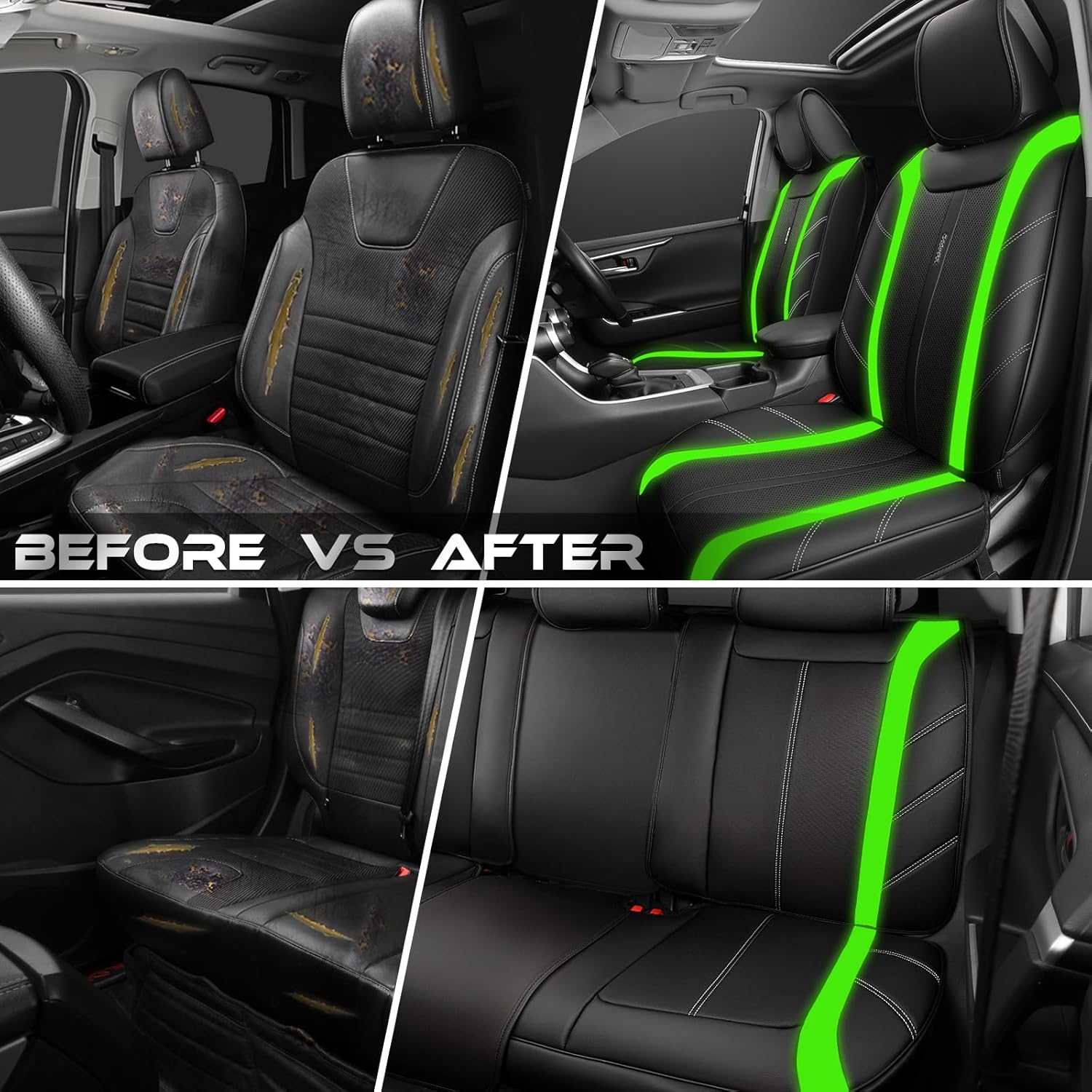 【PREMIUM LEATHER】The sporty design full set car seat covers made of high-grade leather, which no odor and Comfortable touch. It is breathable, waterproof, wear-resistant, easy to clean and suitable for all seasons. It is equipped with thick and high-quality high-density foam to create top elasticity and achieve maximum comfort during driving.
