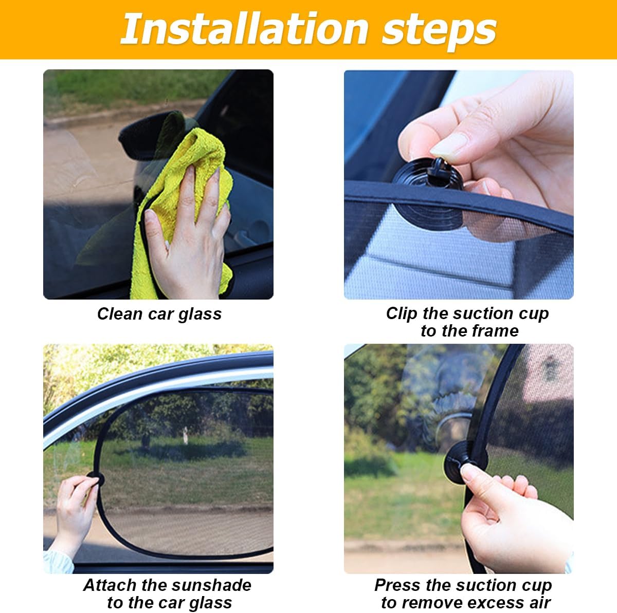 【Easy to Use】: The car window sunshade is very convenient to use. It is equipped with suction cups, you can directly use the suction cups to attach the sunshade to the window. Installation is simple and removal is just as easy. If the suction cup is deformed due to packaging, you can put it in boiling water to restore the original shape.