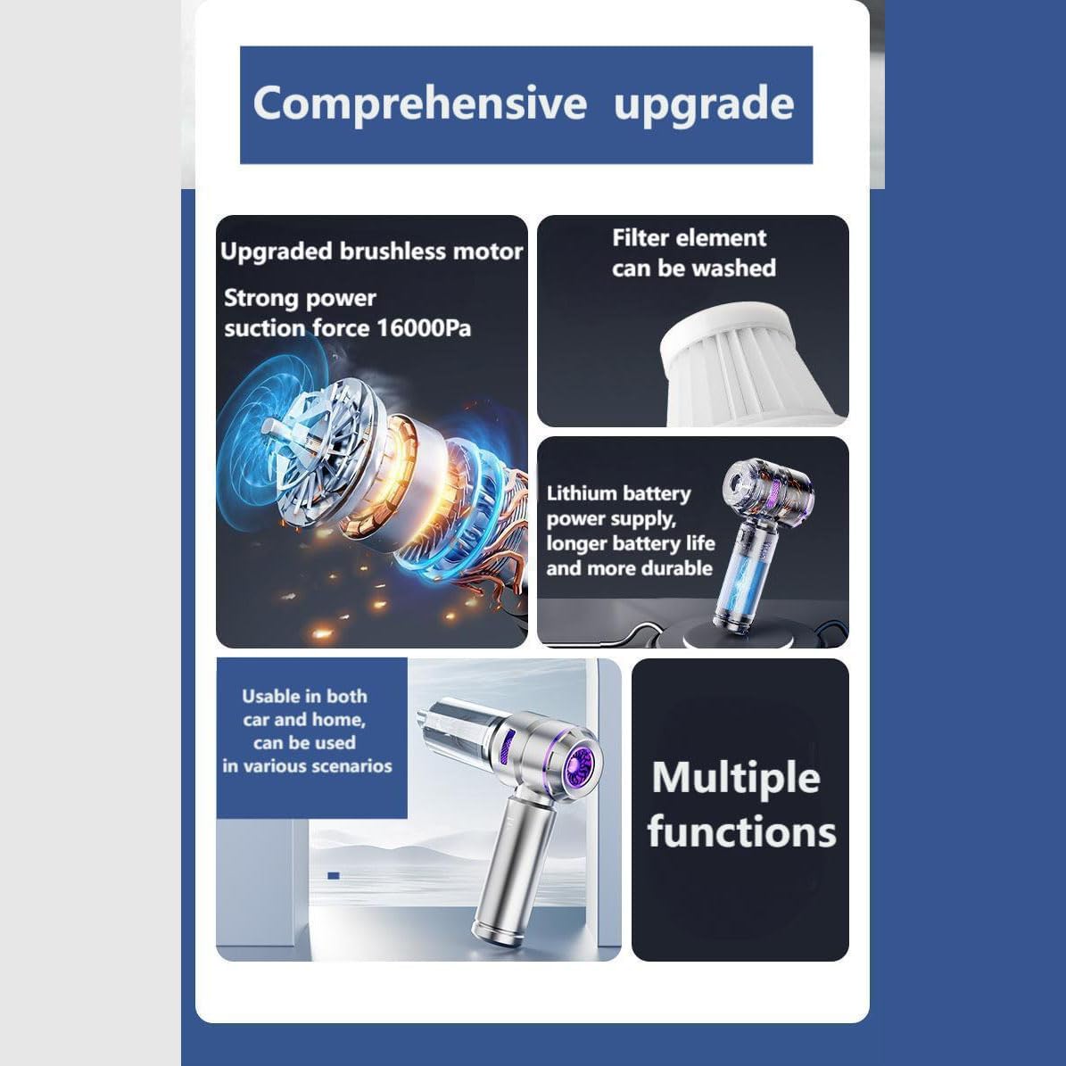 ➤7 practical suction nozzle tools: Handheld vacuum cleaner, equipped with 7 different types of accessories, can achieve efficient suction and deep cleaning. Different nozzles are used to clean uneven surfaces, hair and dust in the gaps of cars or keyboards, dust or fallen leaves on the surface of cars, inflatable balloons, swimming rings, etc.; used for suction or inflation; can also be used as a hairbrush. The dryer is used to dry clothes and hair.